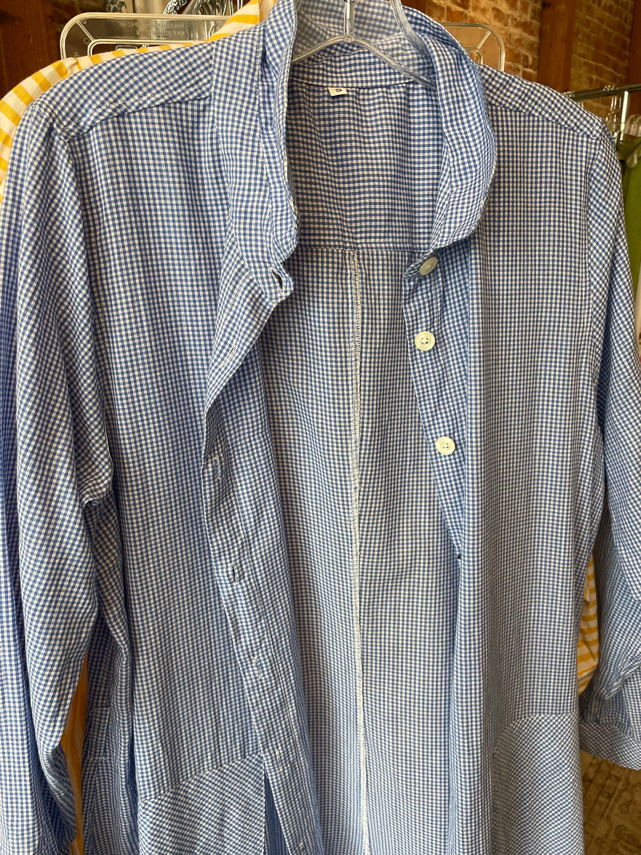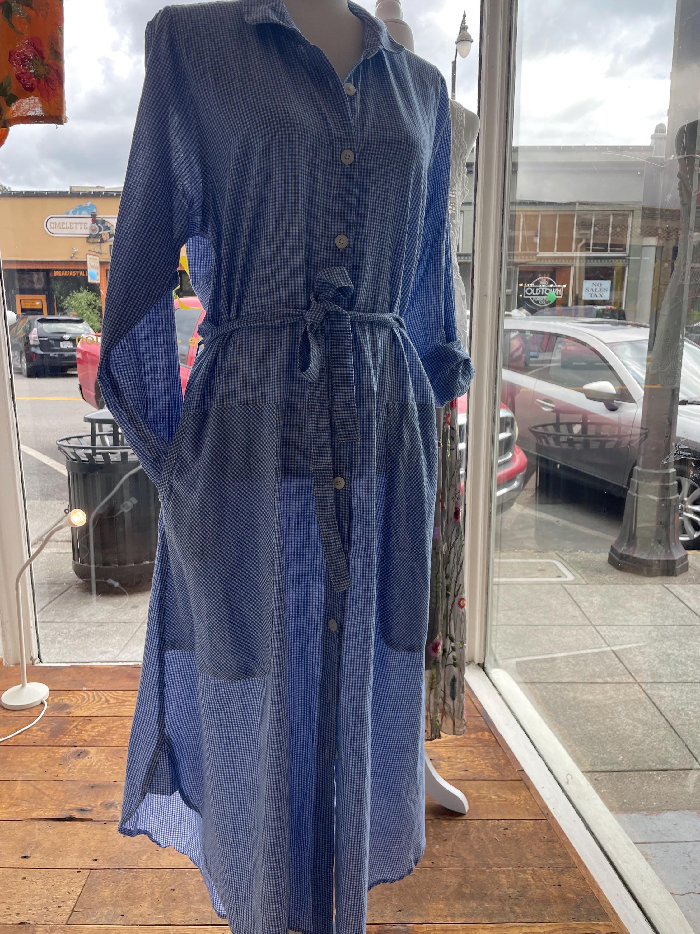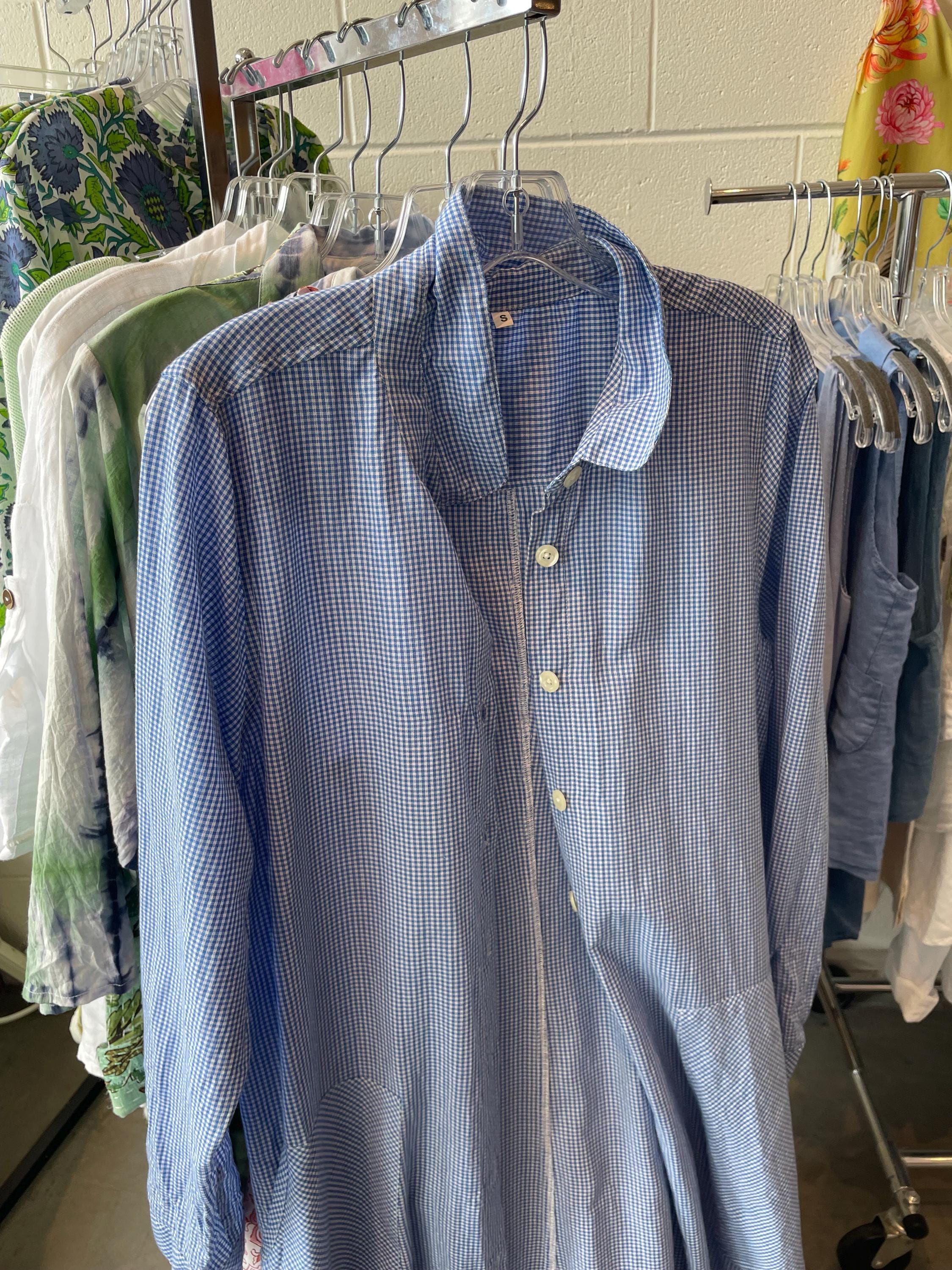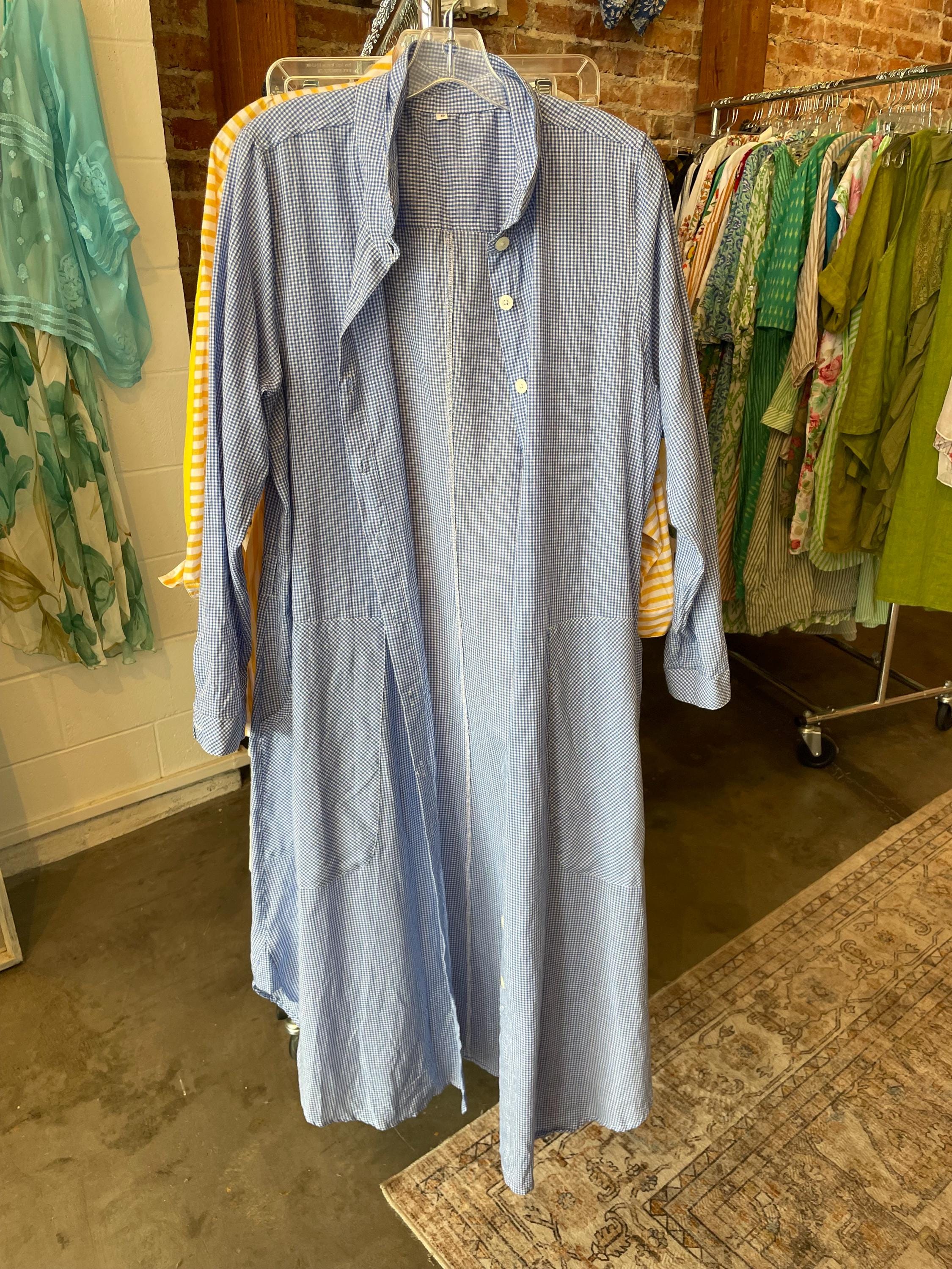 This is a shirtdress in very lightweight cotton. It is very soft and luscious. You may also wear this as a long duster with the bottom tied up. It has big deep pockets and it’s very versatile. You can belt it or leave it hanging loose. Wear it open over another dress or with jeans and a tank top. Shirt tail bottom makes it casual but you can definitely dress it up. May be machine washed and hung to dry. Great for travel!