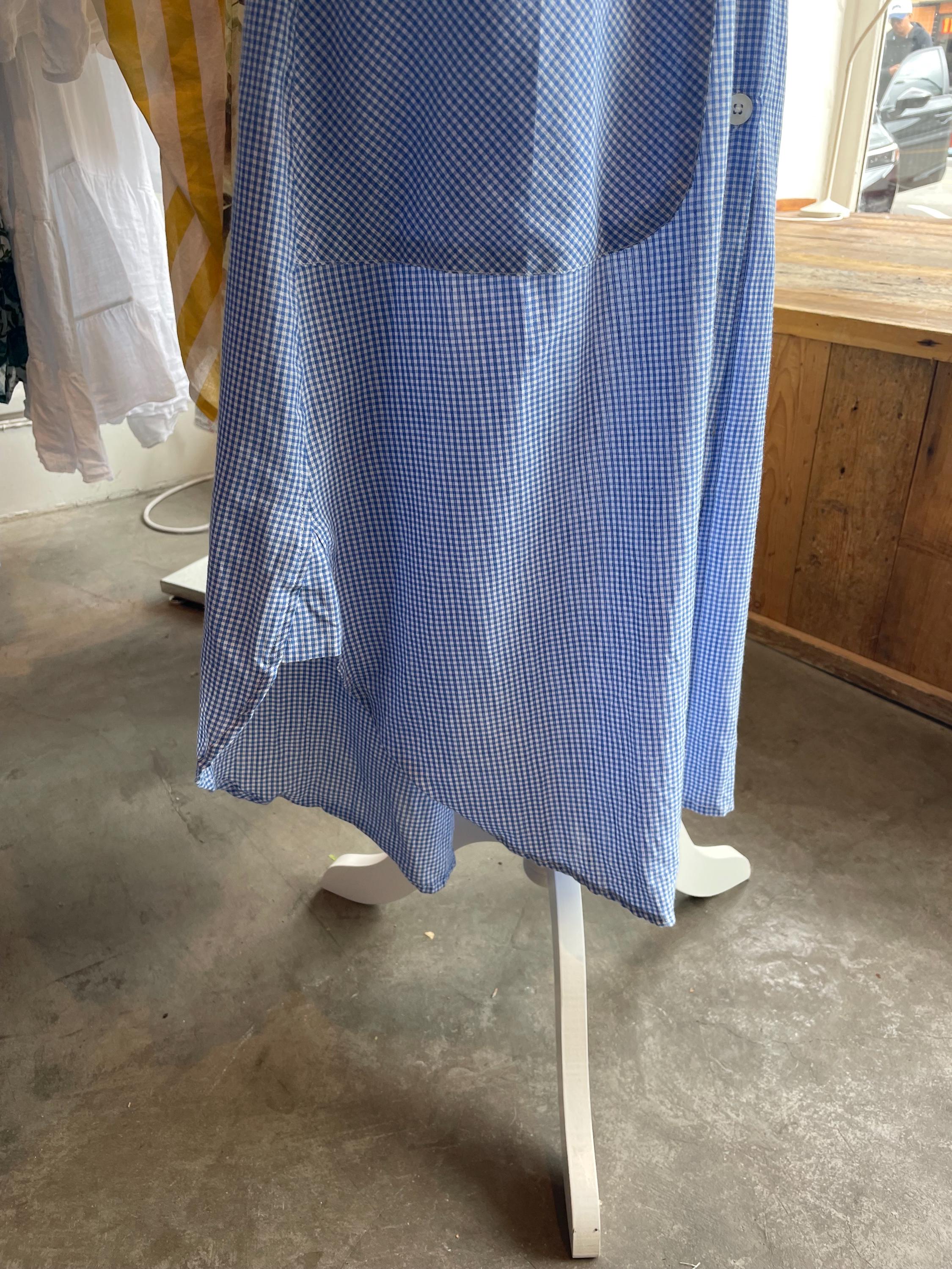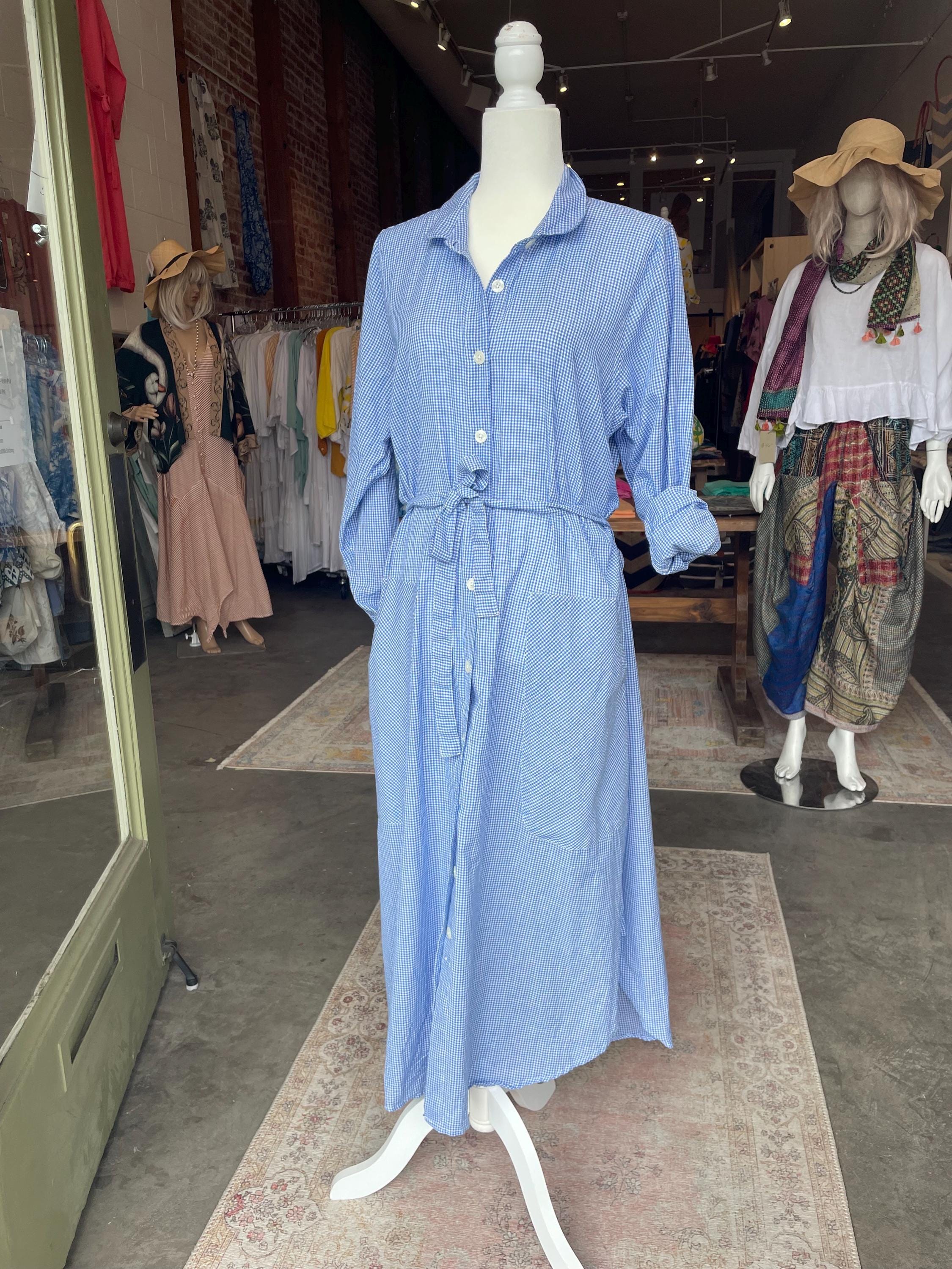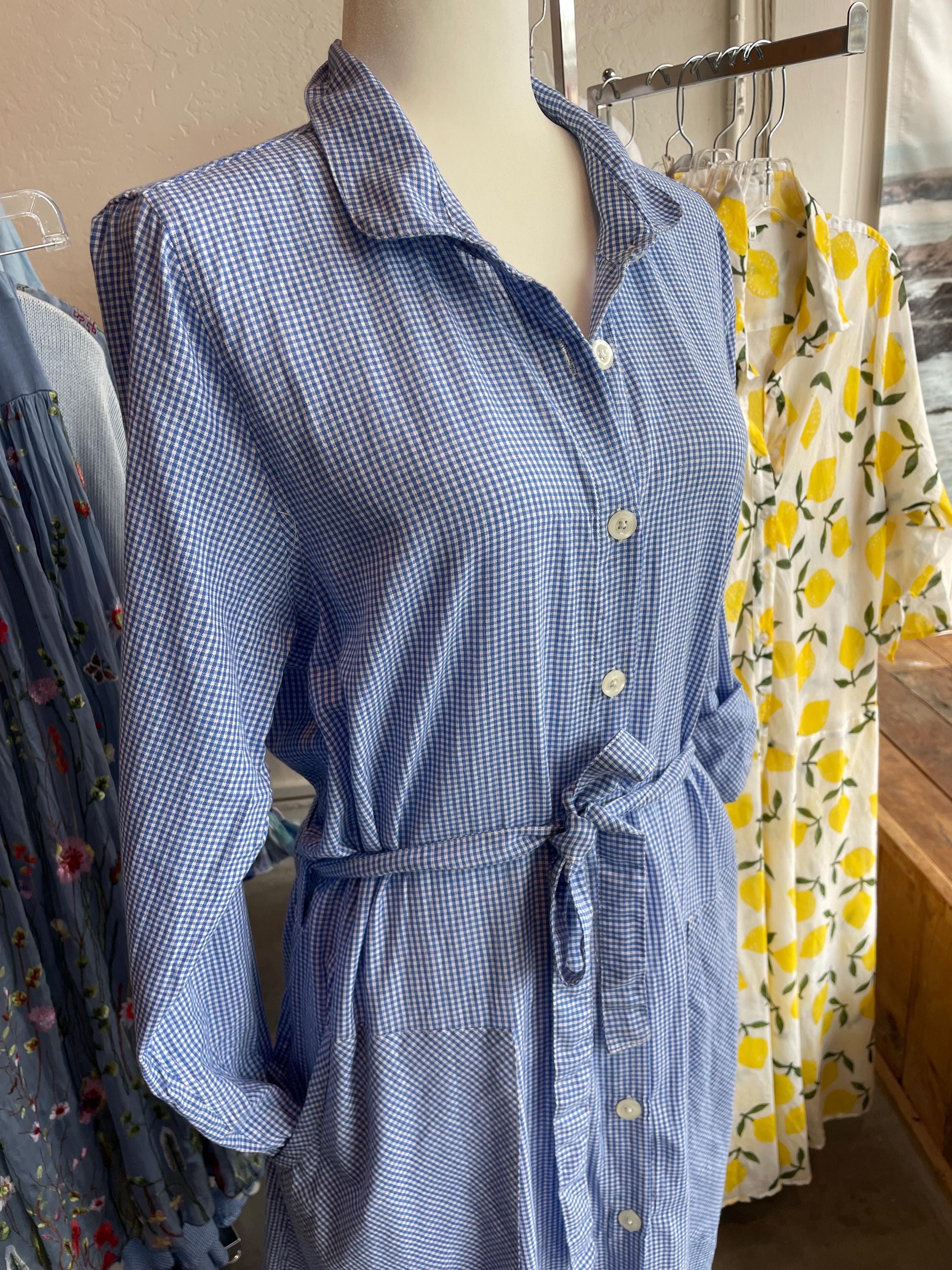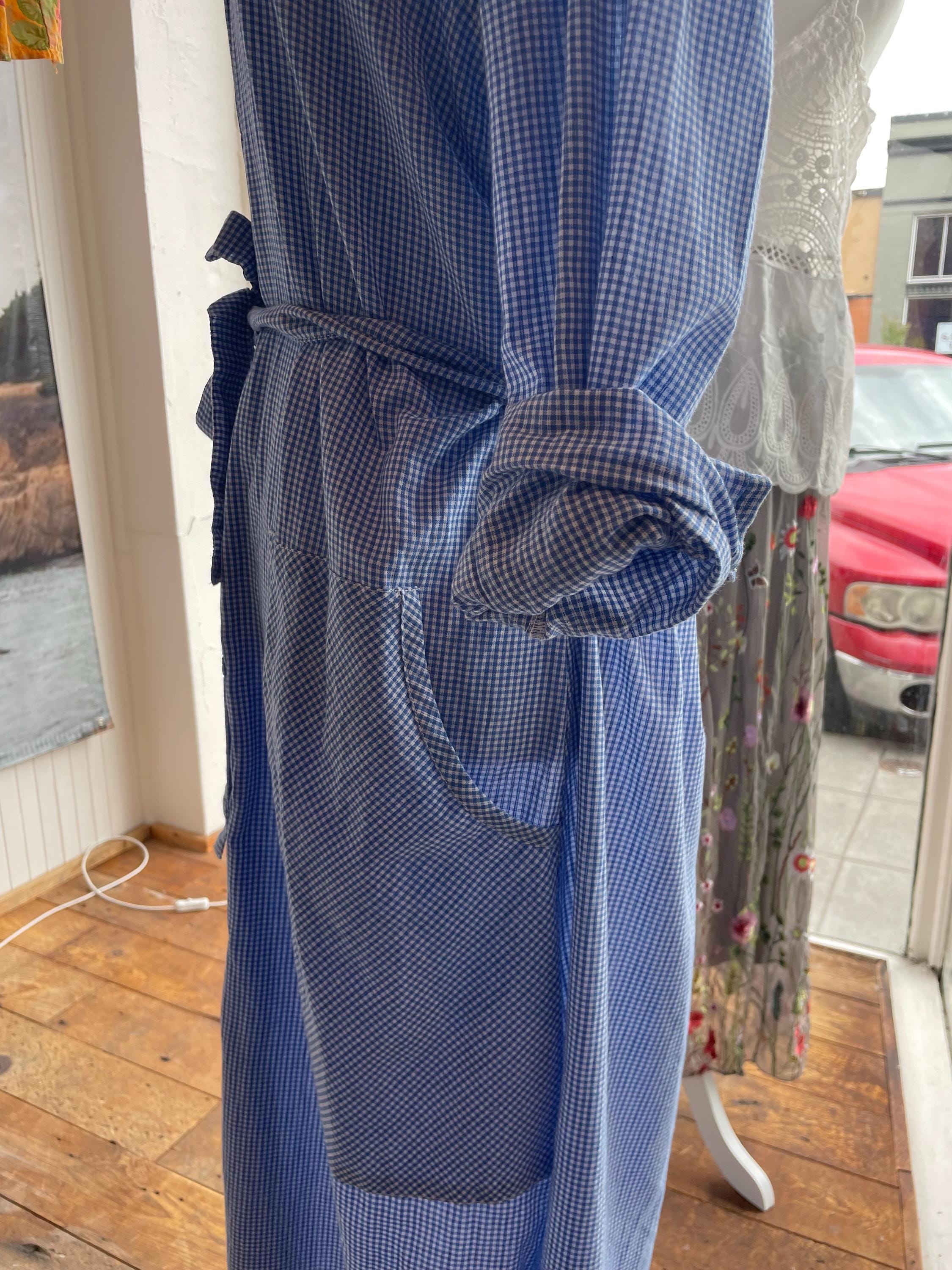 This is a shirtdress in very lightweight cotton. It is very soft and luscious. You may also wear this as a long duster with the bottom tied up. It has big deep pockets and it’s very versatile. You can belt it or leave it hanging loose. Wear it open over another dress or with jeans and a tank top. Shirt tail bottom makes it casual but you can definitely dress it up. May be machine washed and hung to dry. Great for travel!