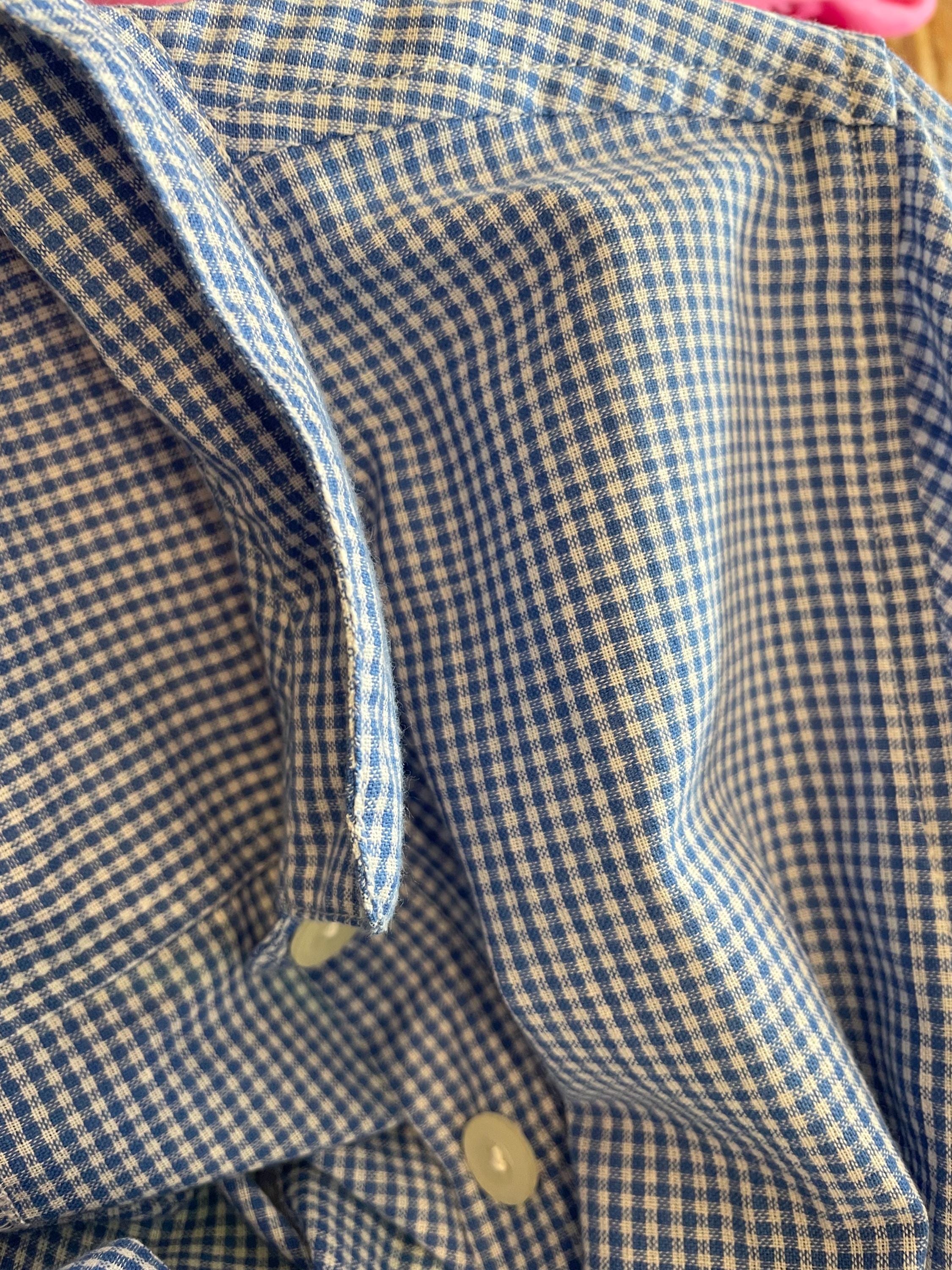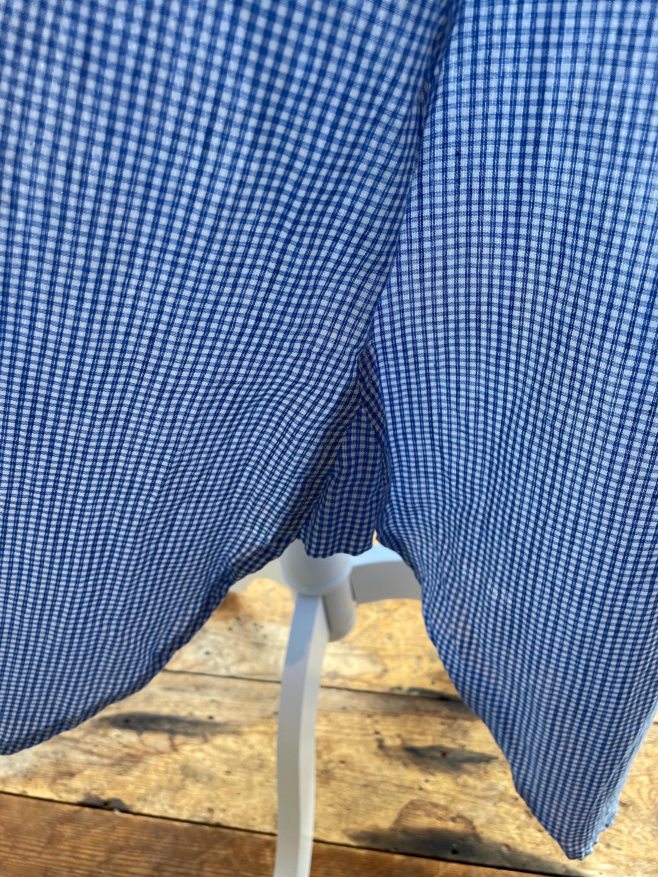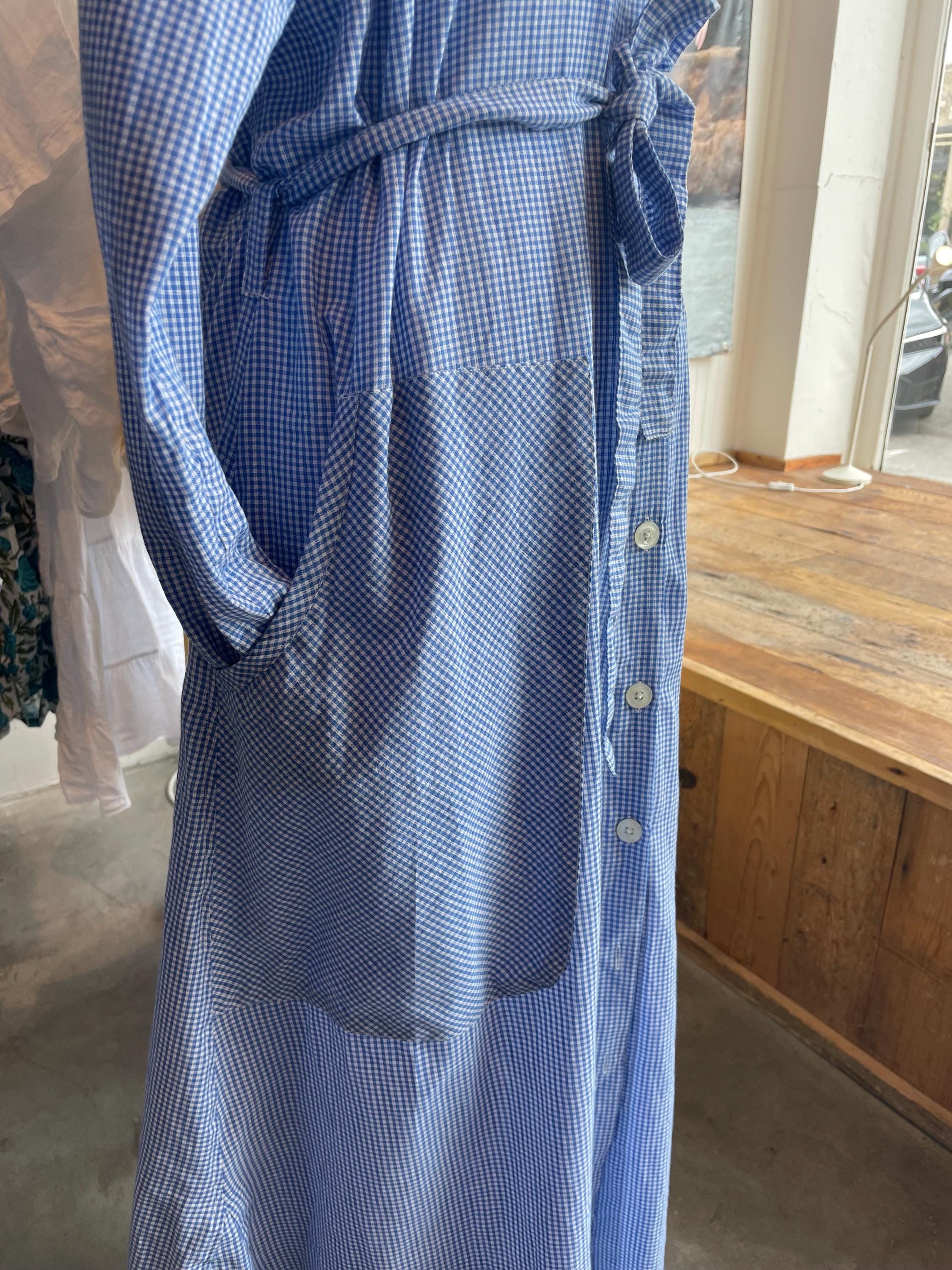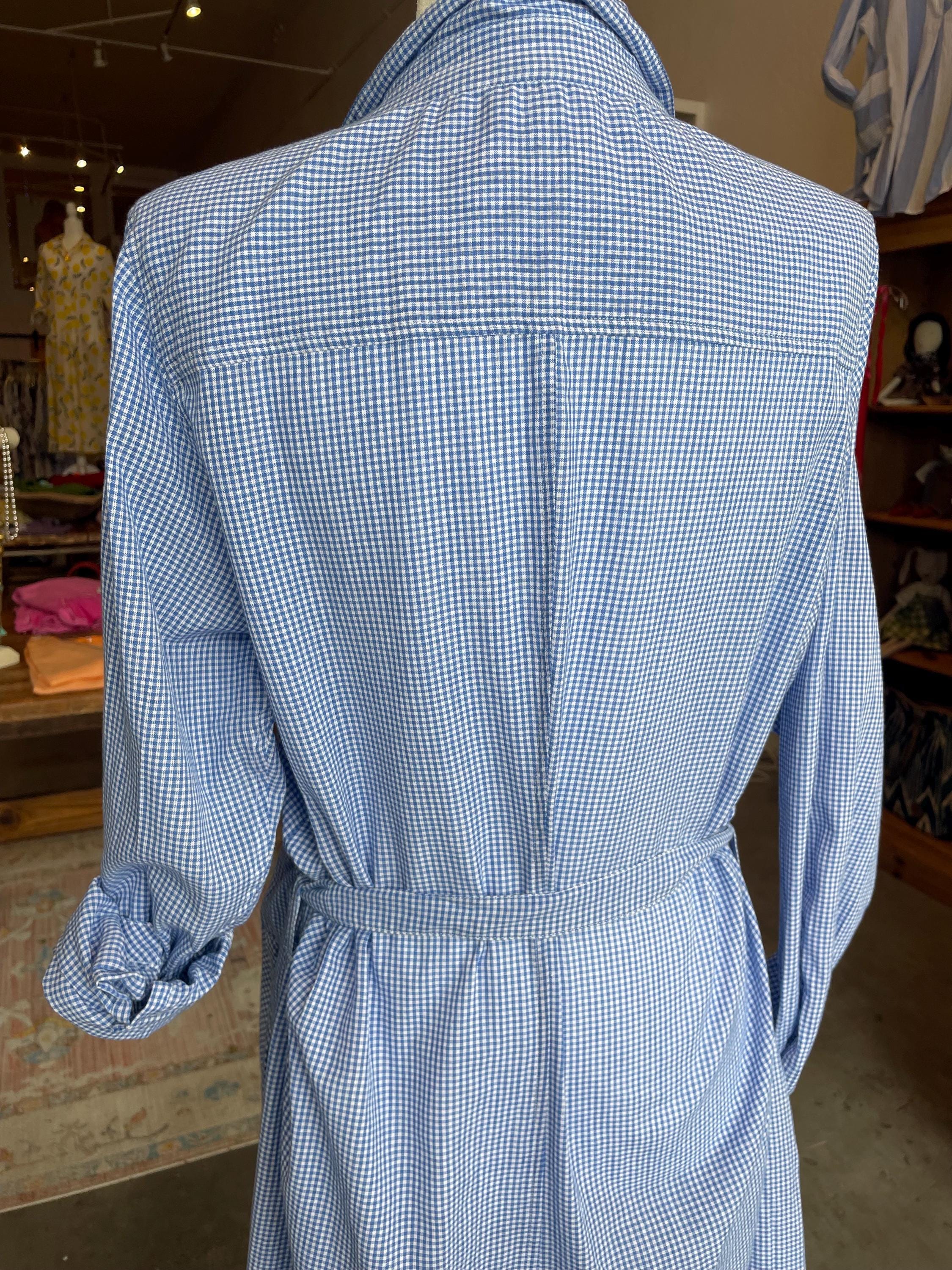This is a shirtdress in very lightweight cotton. It is very soft and luscious. You may also wear this as a long duster with the bottom tied up. It has big deep pockets and it’s very versatile. You can belt it or leave it hanging loose. Wear it open over another dress or with jeans and a tank top. Shirt tail bottom makes it casual but you can definitely dress it up. May be machine washed and hung to dry. Great for travel!