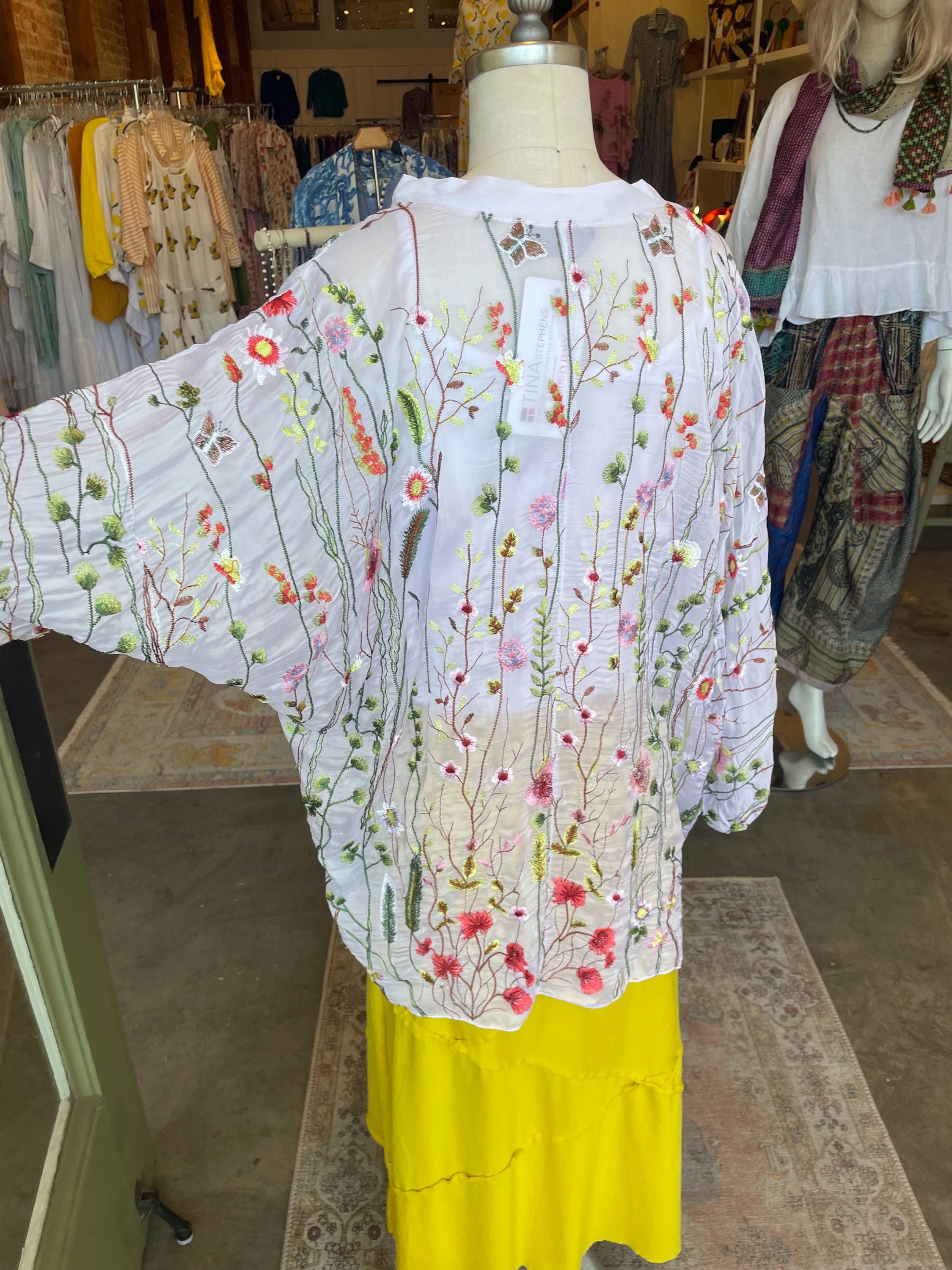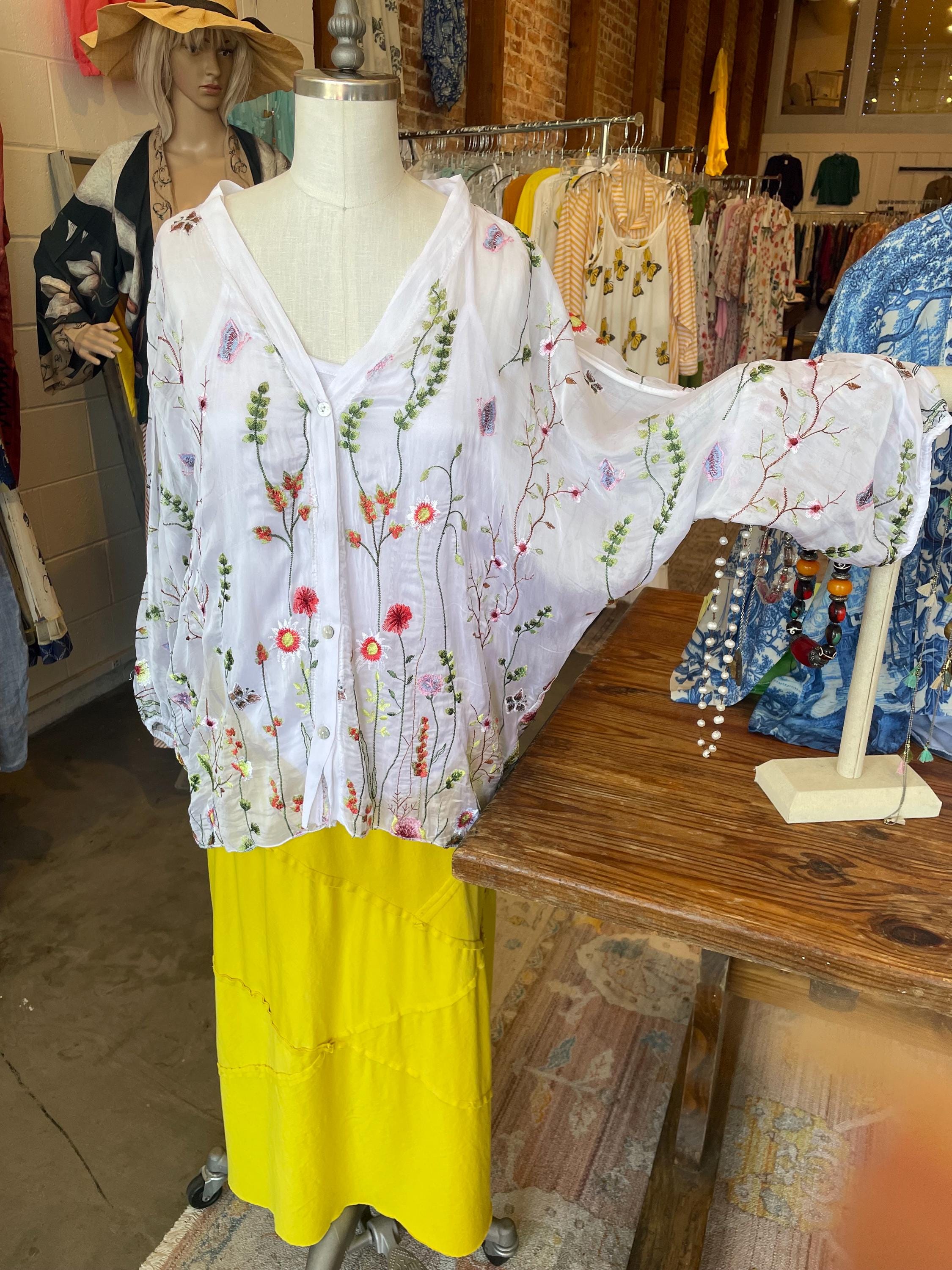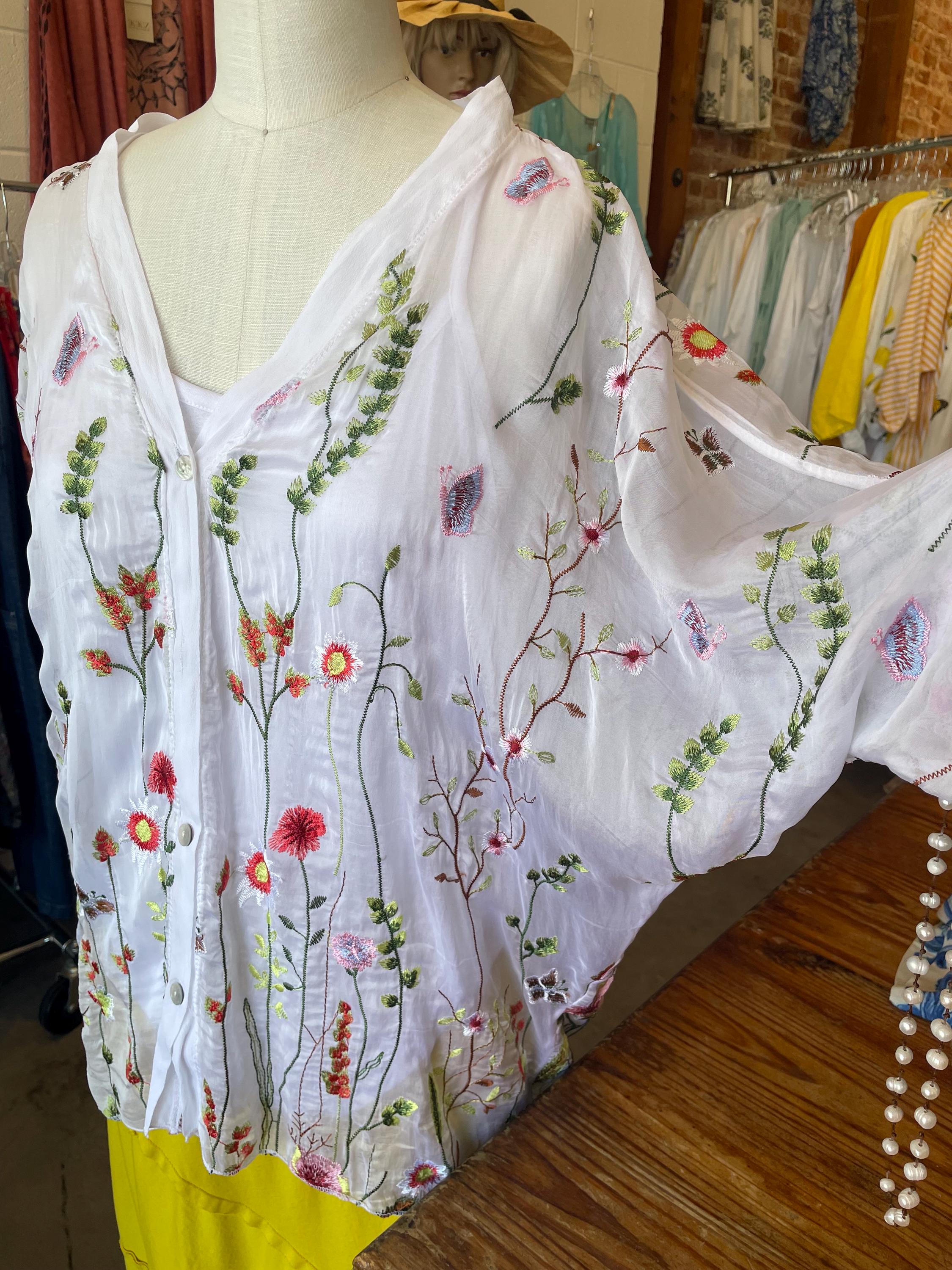 Loose fitting super lightweight embroidered with flowers and butterflies on silk. it comes with a camisole so you don't have to worry about the sheerness. This is a one size that will fit a size 6 to a size 12