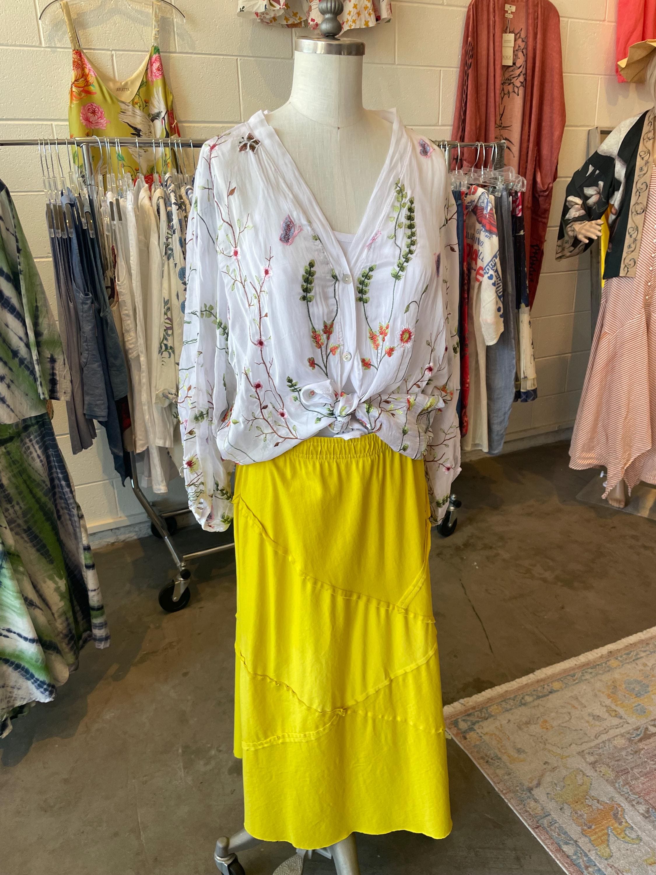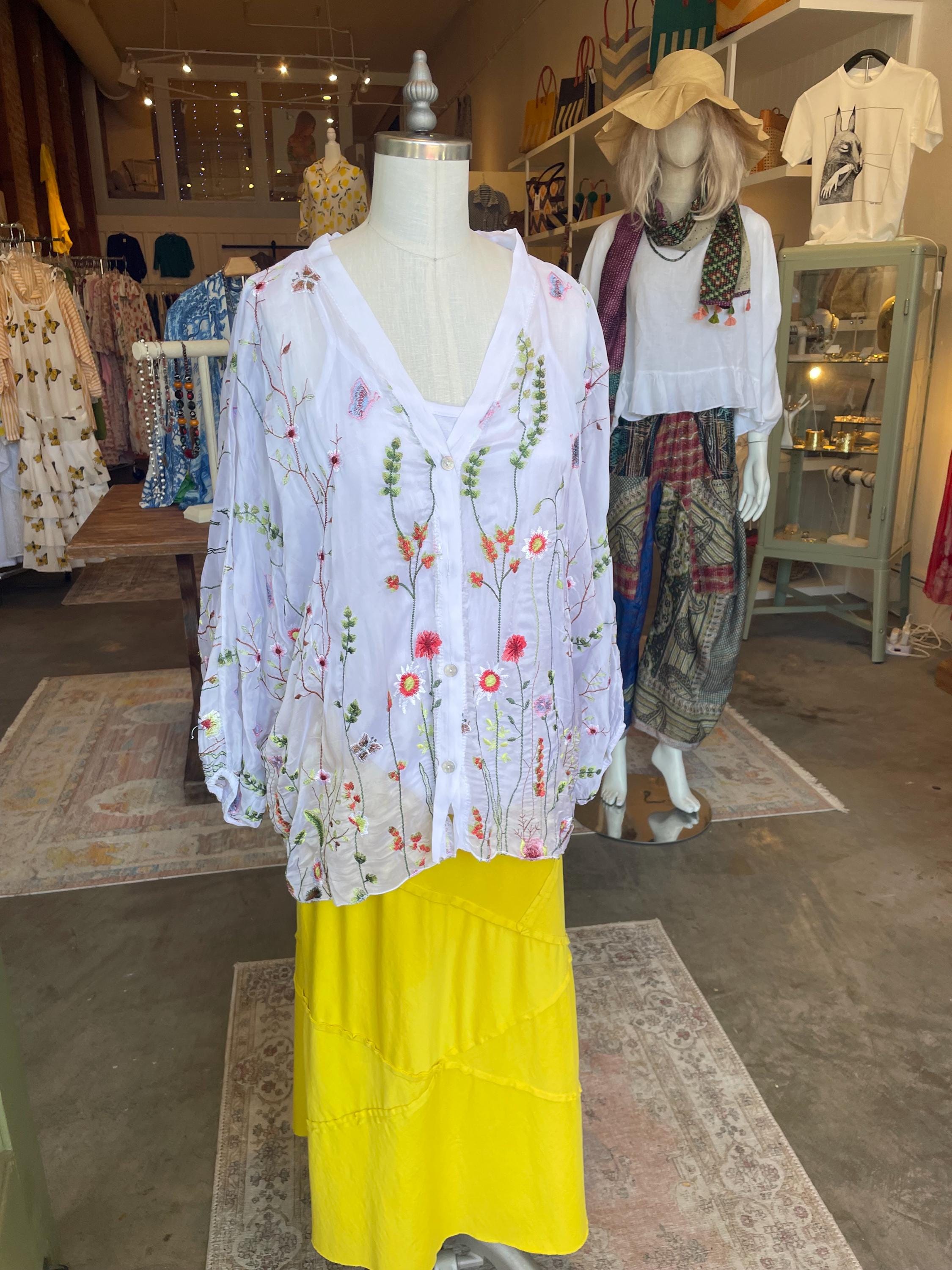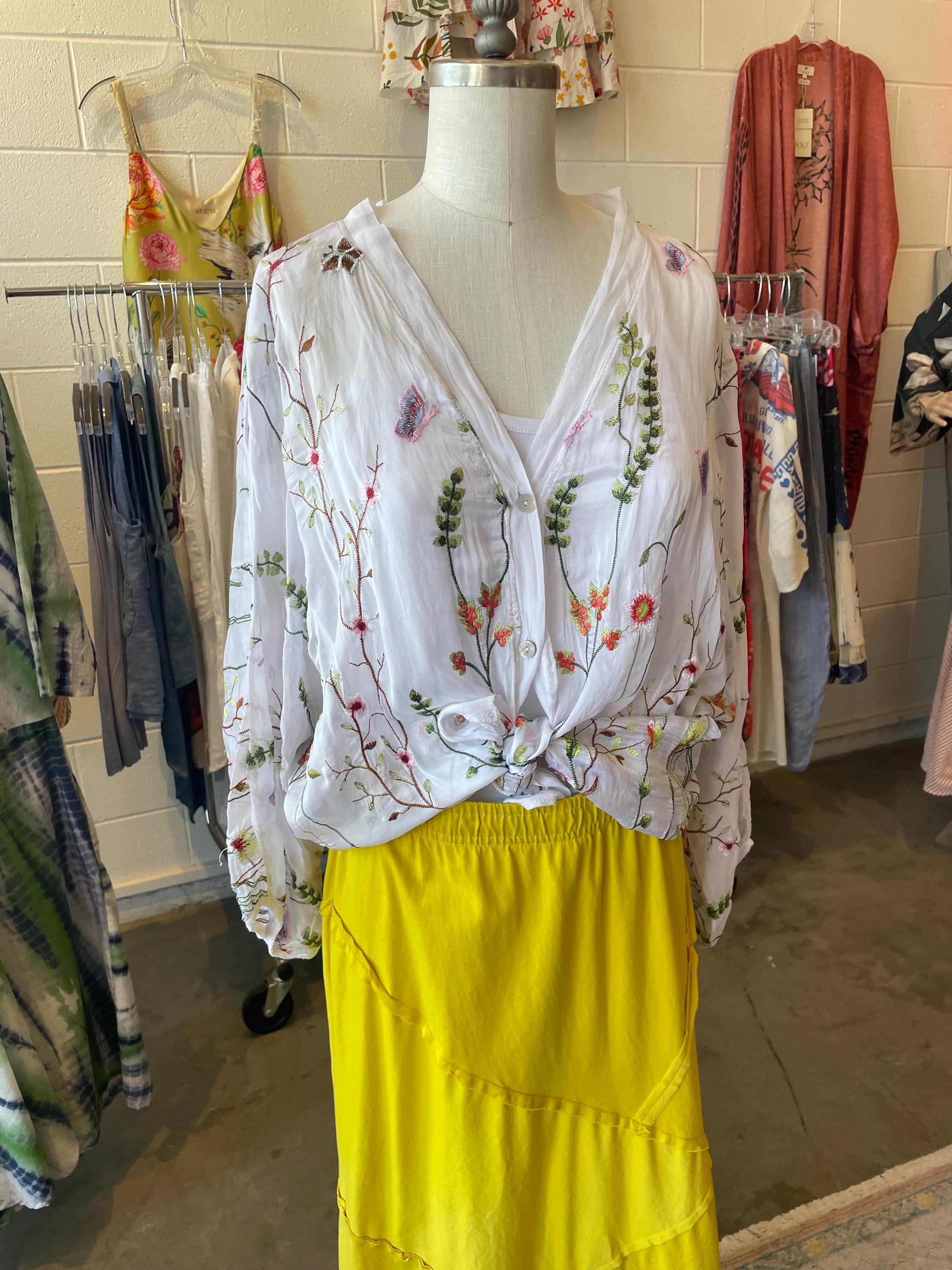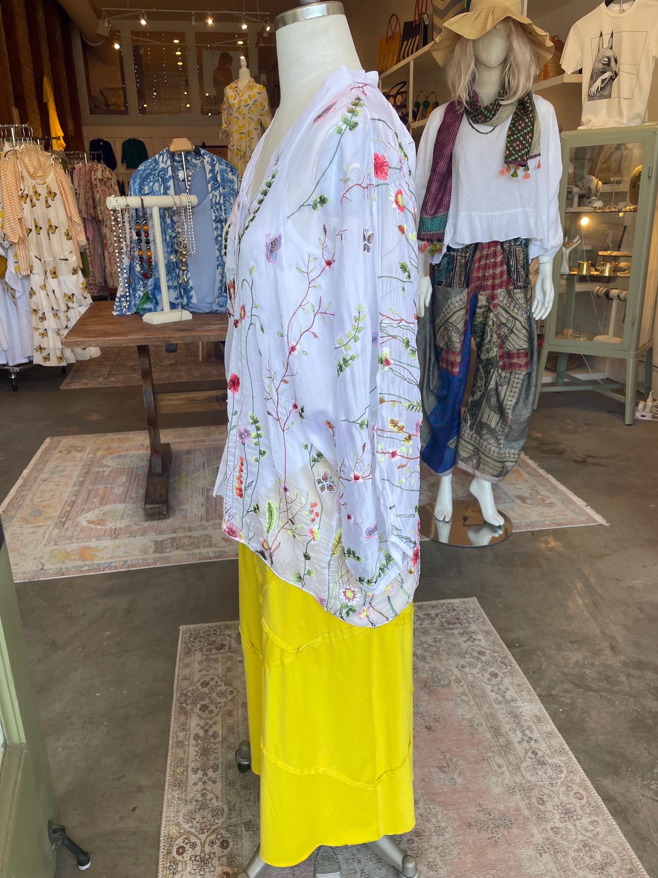 Loose fitting super lightweight embroidered with flowers and butterflies on silk. it comes with a camisole so you don't have to worry about the sheerness. This is a one size that will fit a size 6 to a size 12