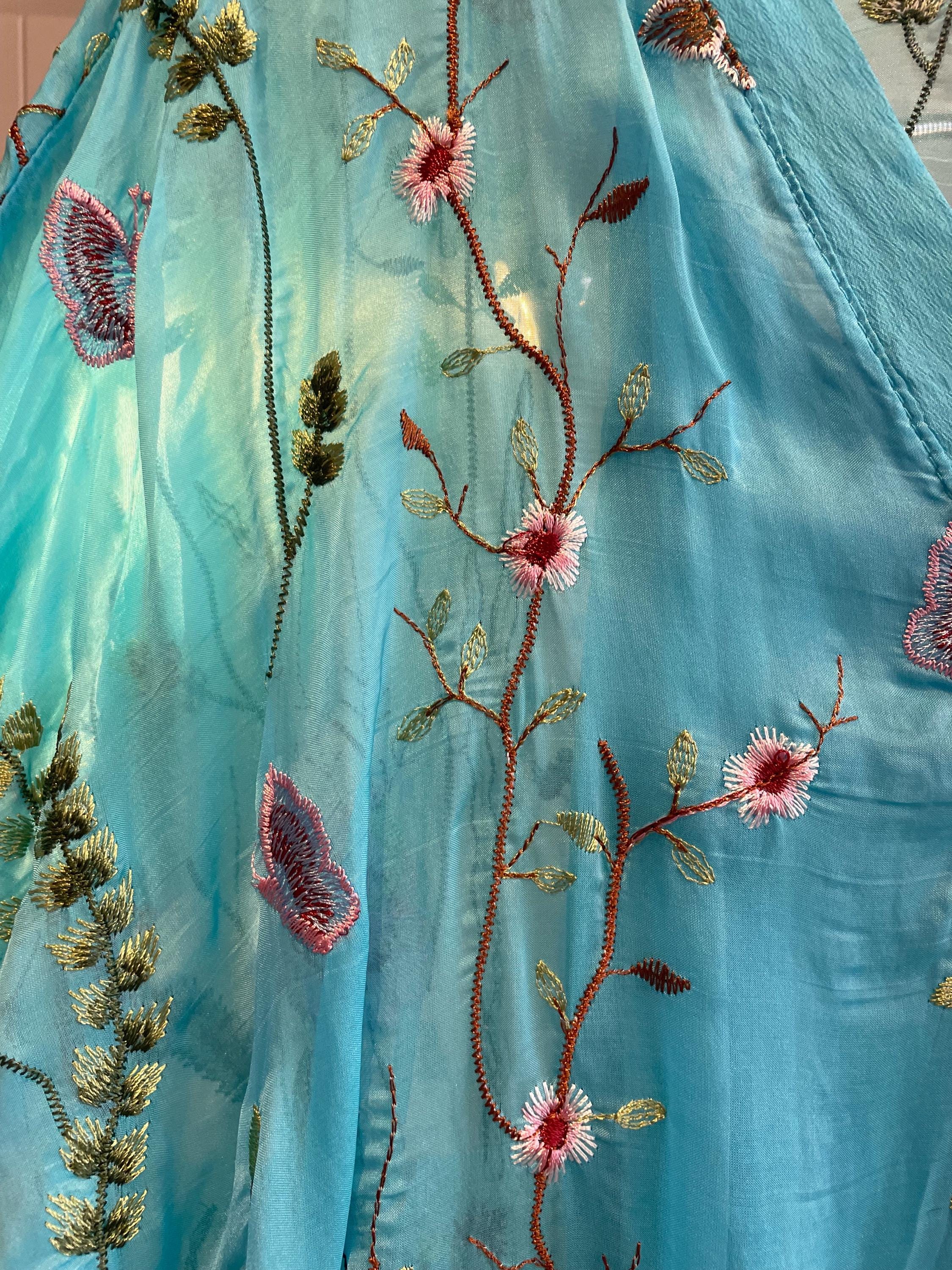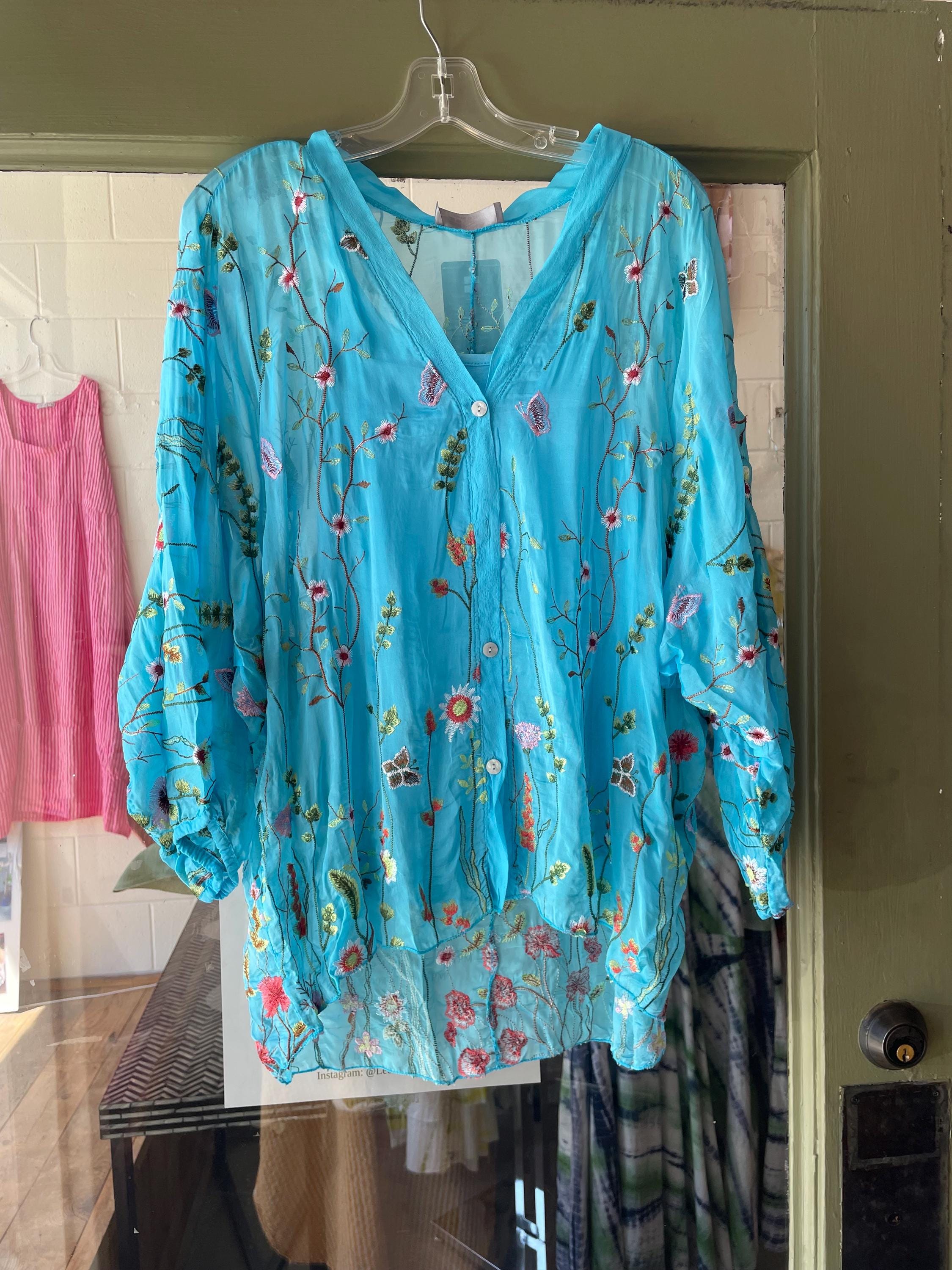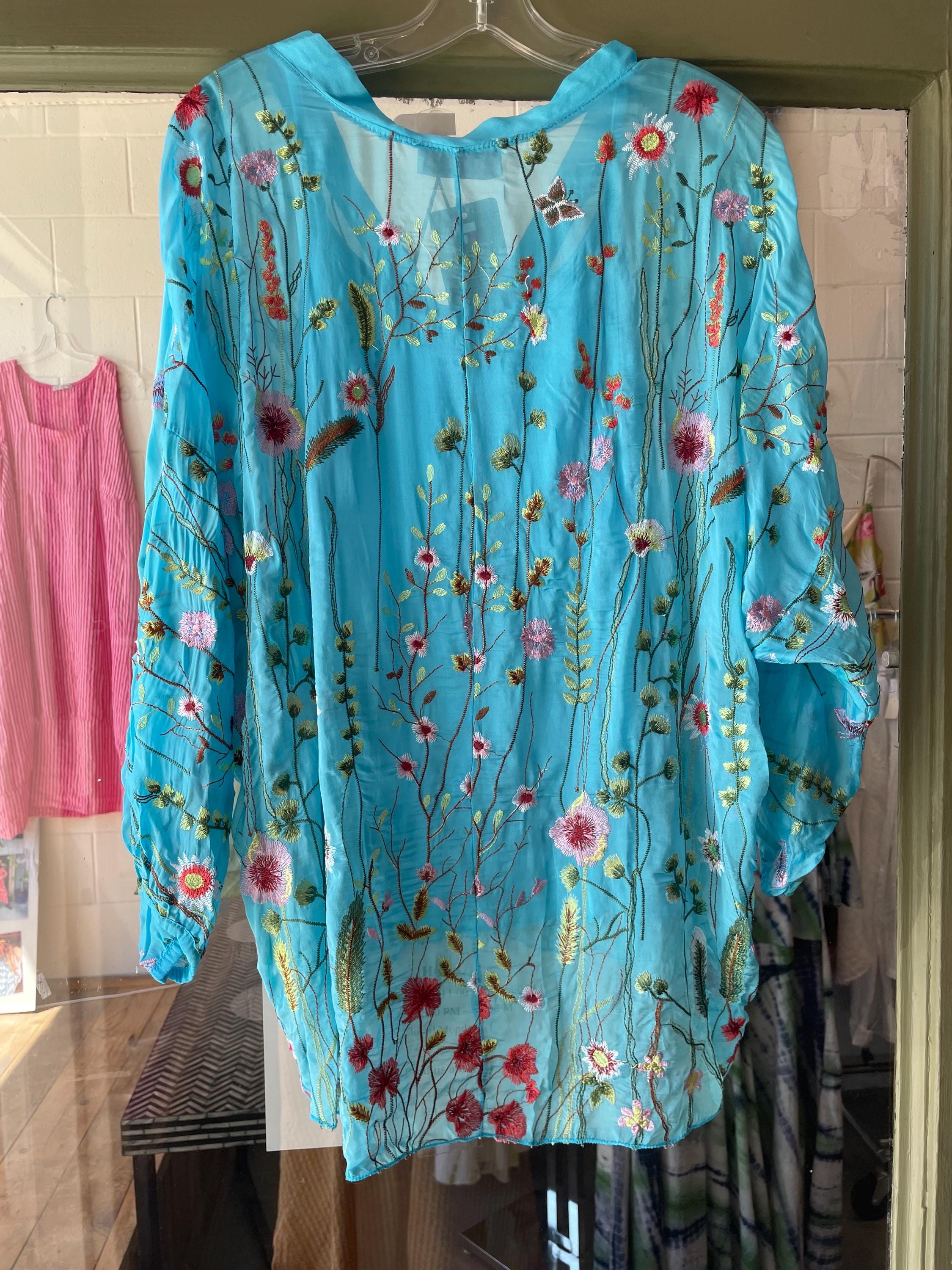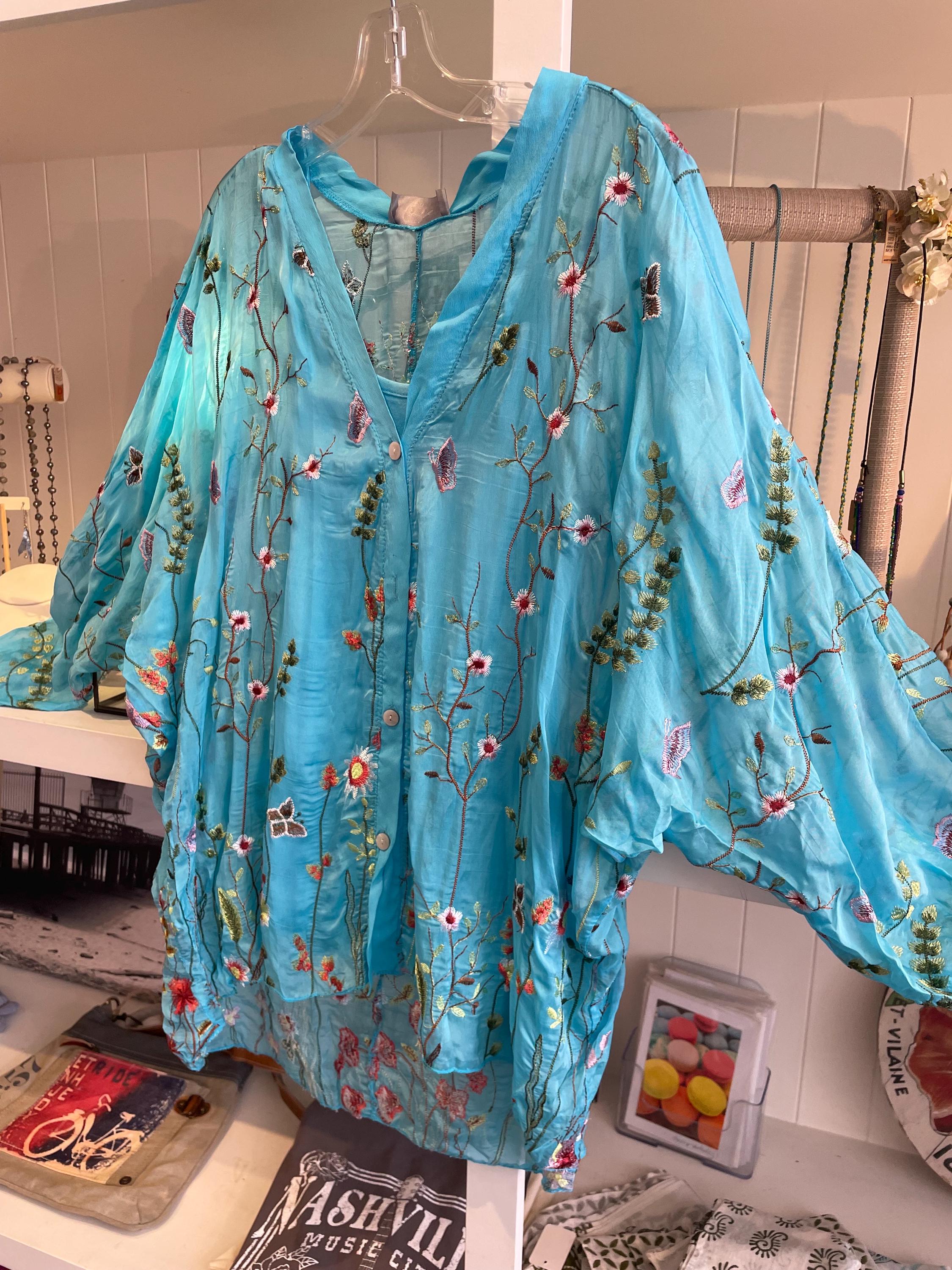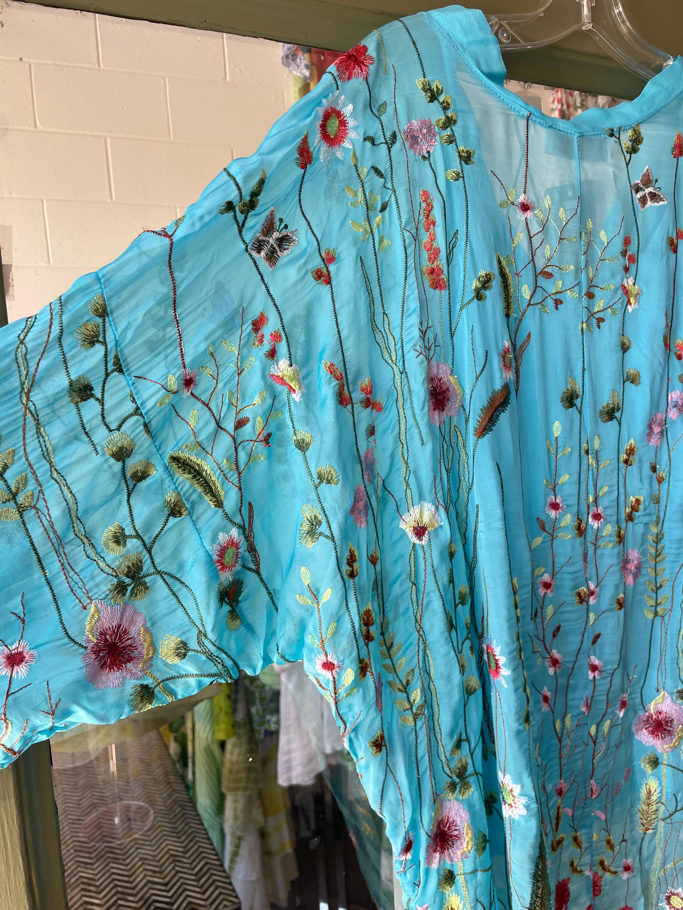 Loose fitting super lightweight embroidered with flowers and butterflies on silk. it comes with a camisole so you don't have to worry about the sheerness. This is a one size that will fit a size 6 to a size 12