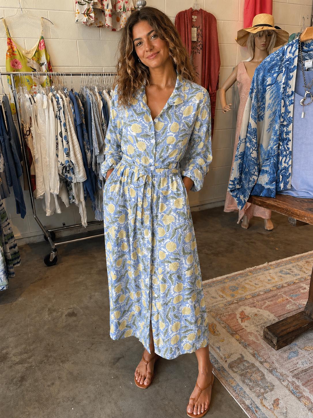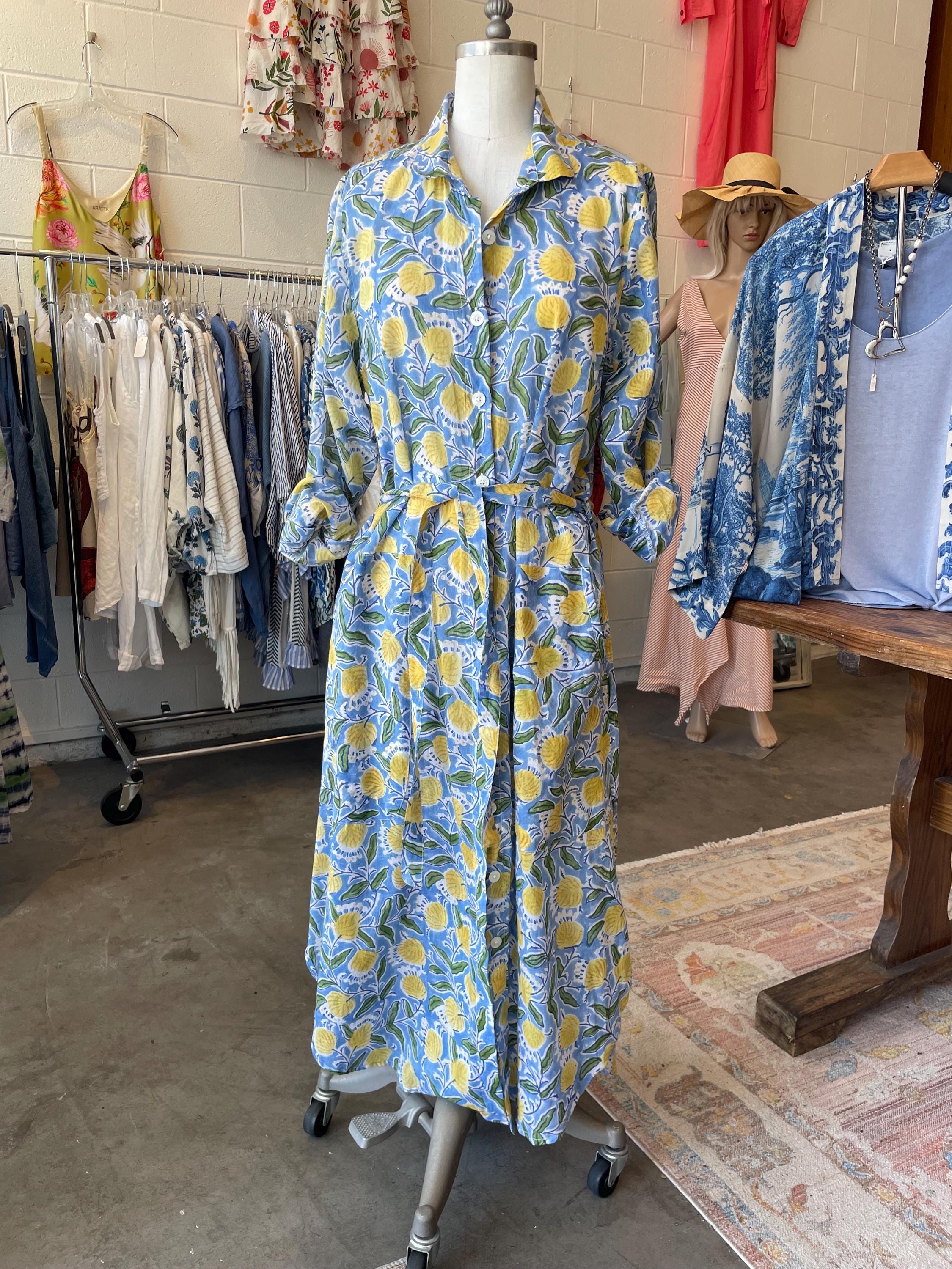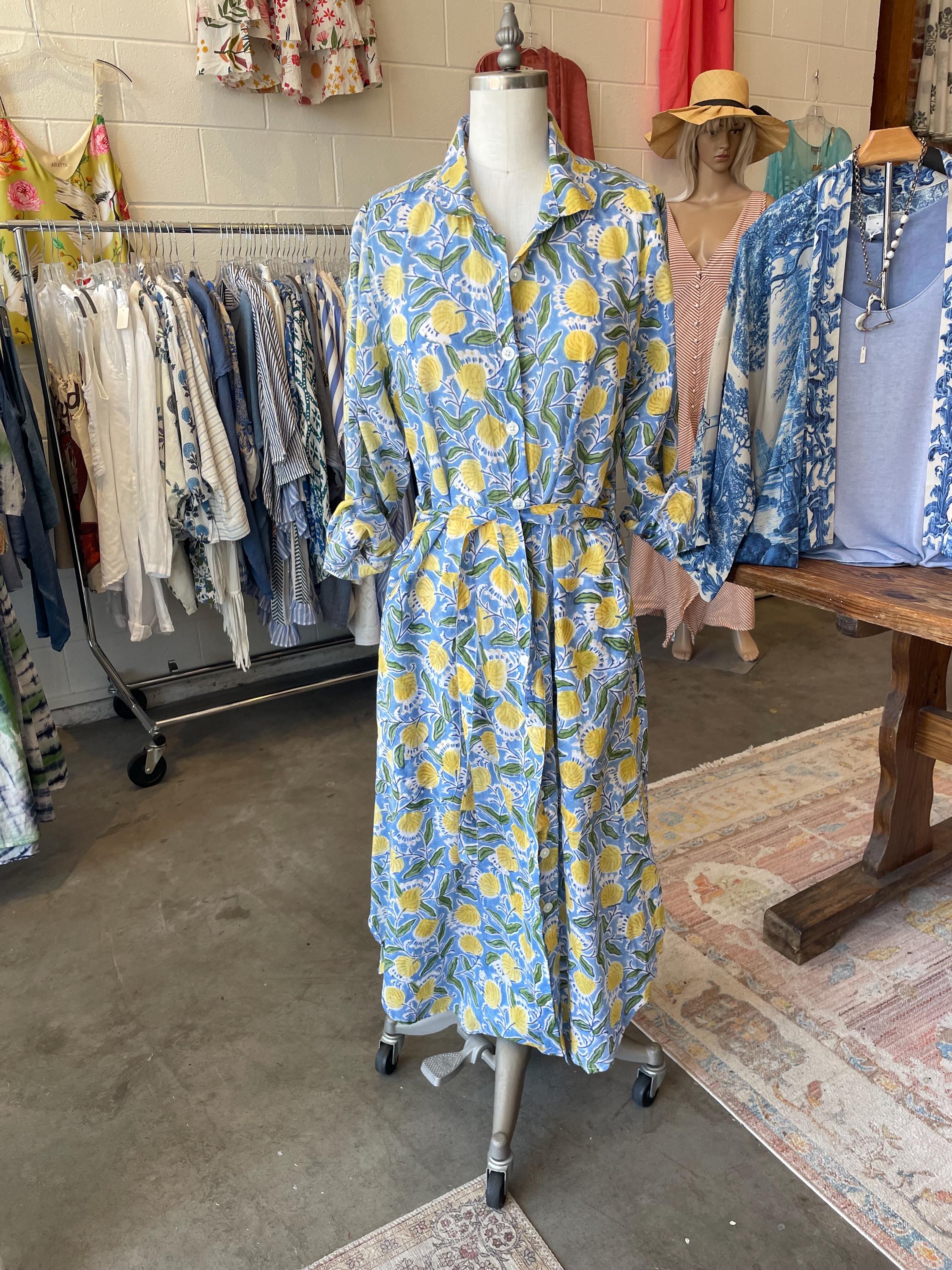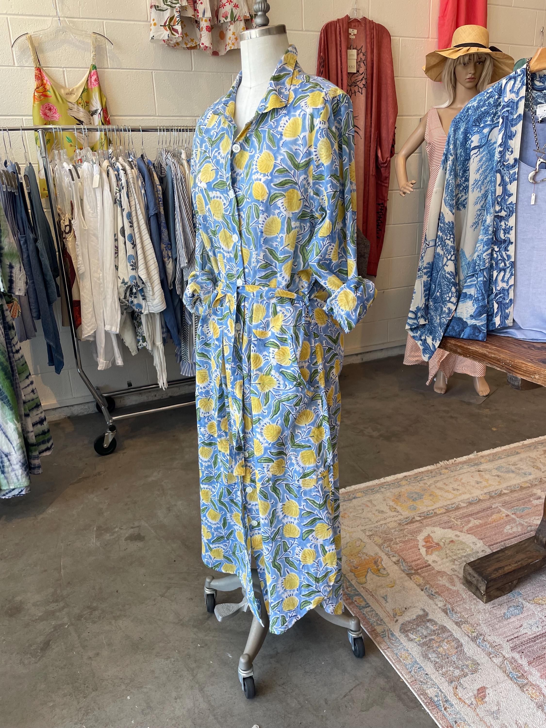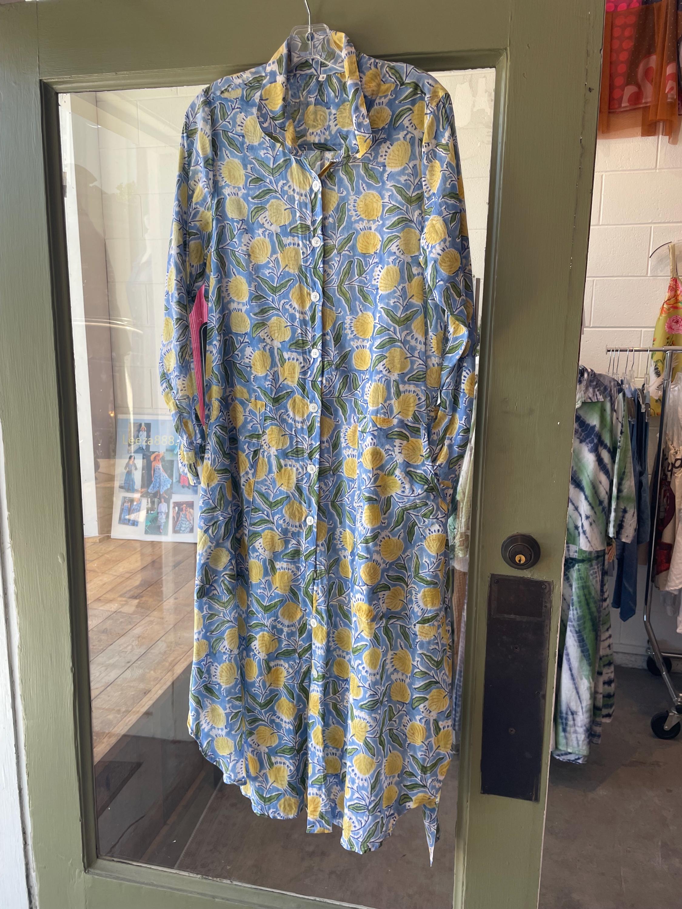 Blue and yellow blockprint floral cotton voile button down shirtdress/duster