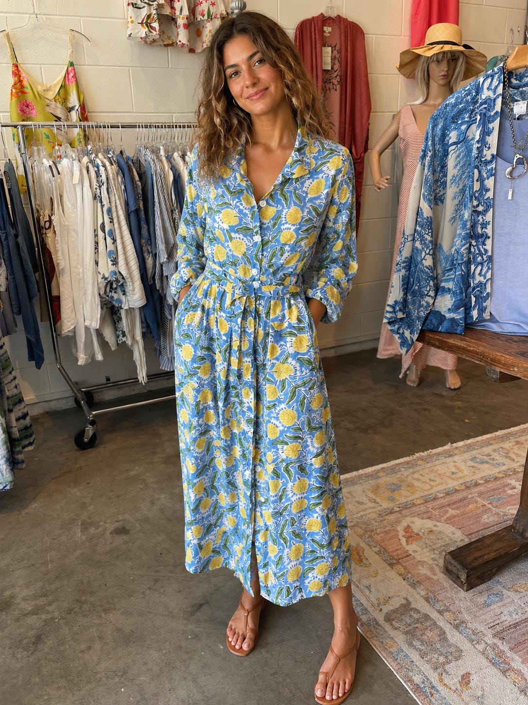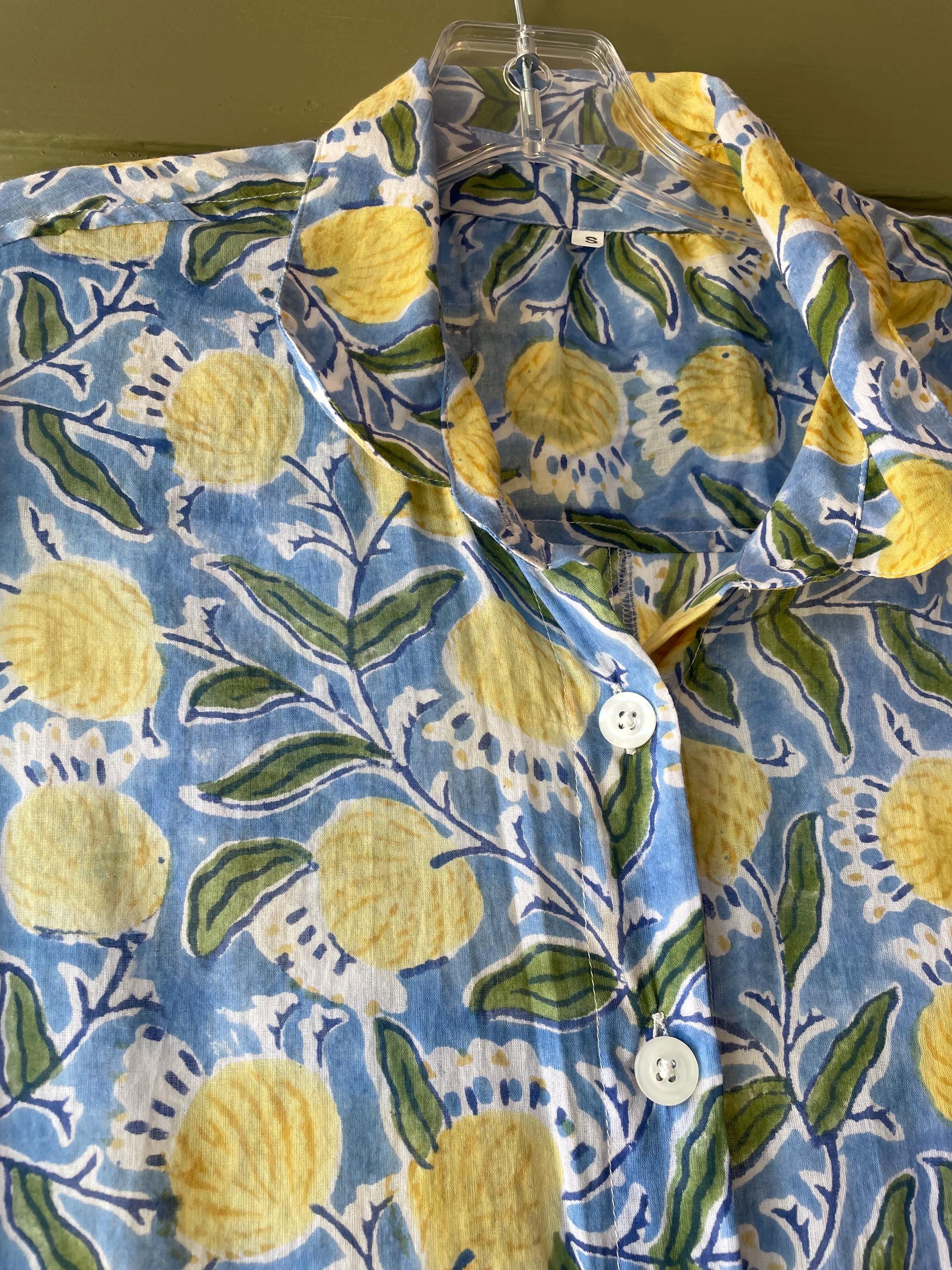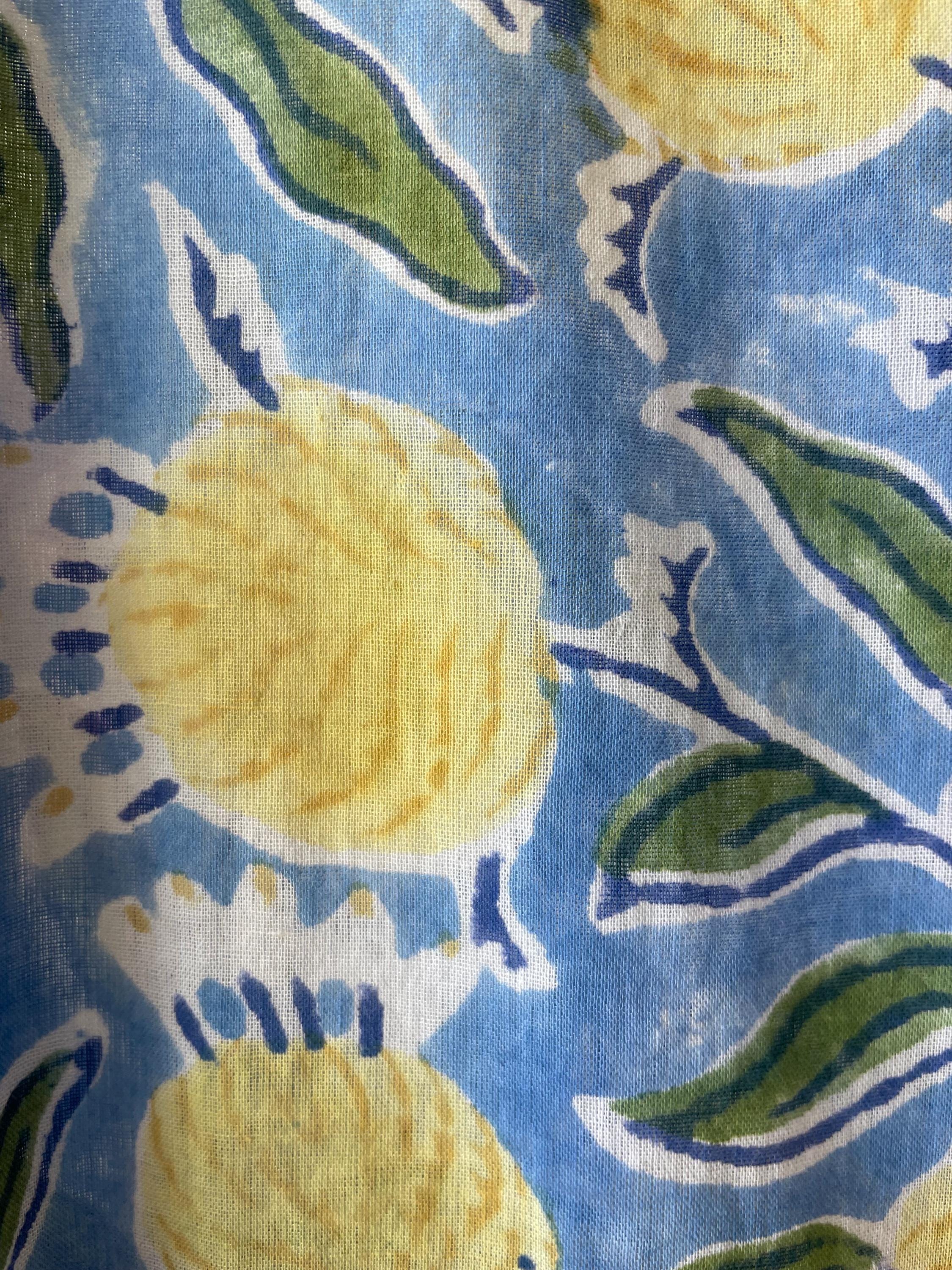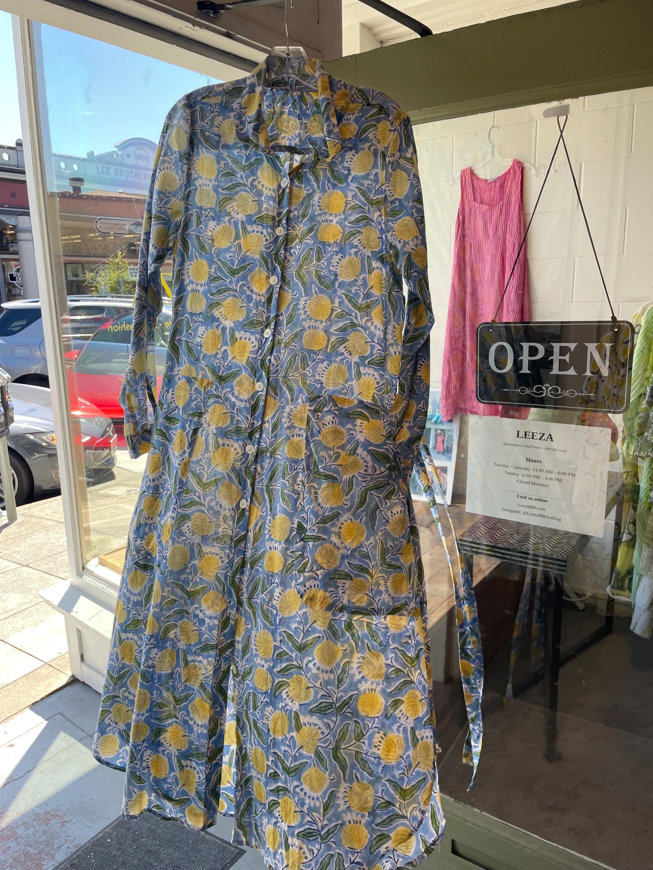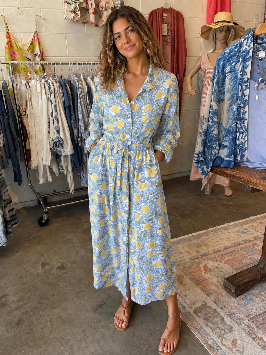 Blue and yellow blockprint floral cotton voile button down shirtdress/duster