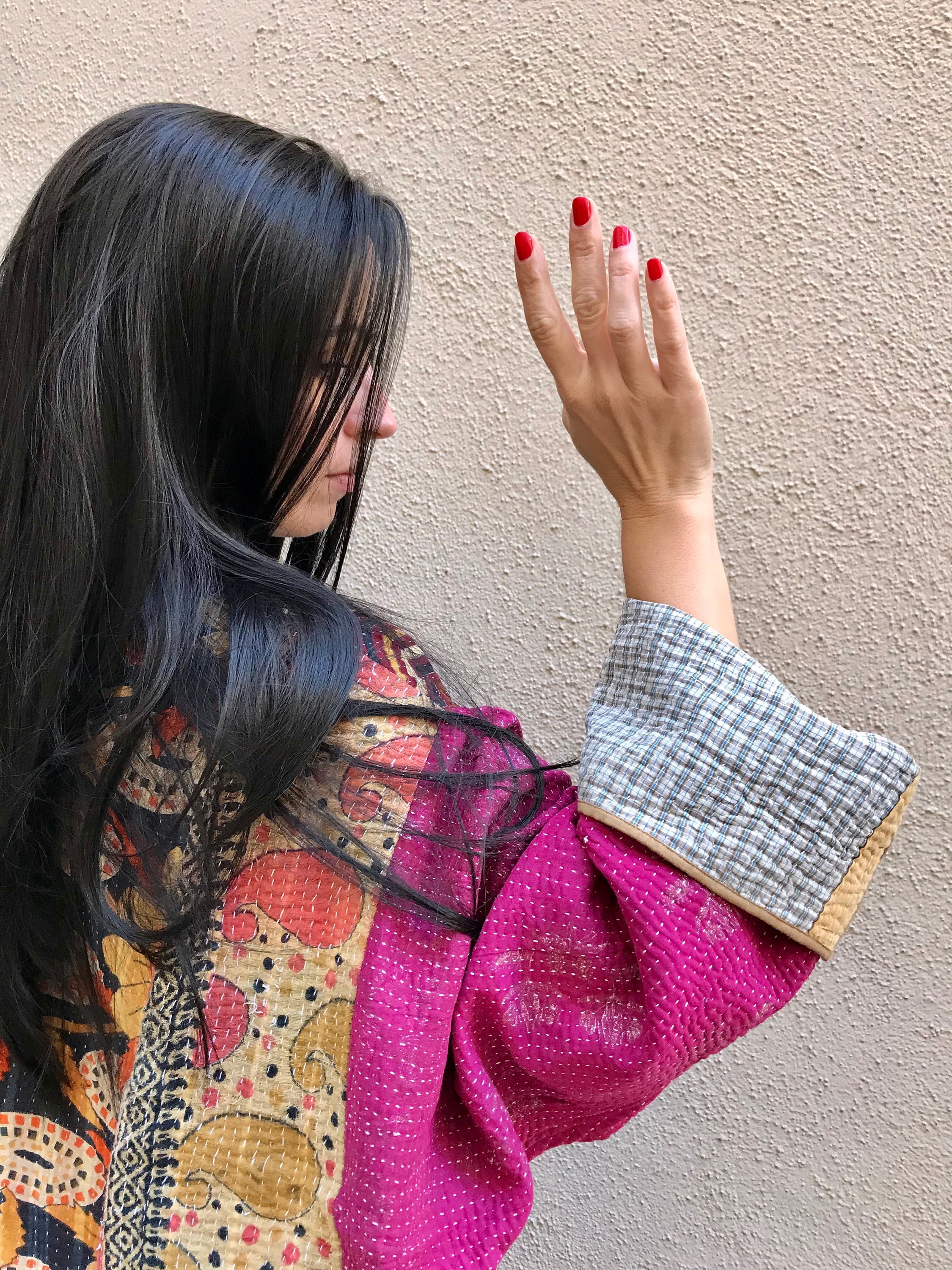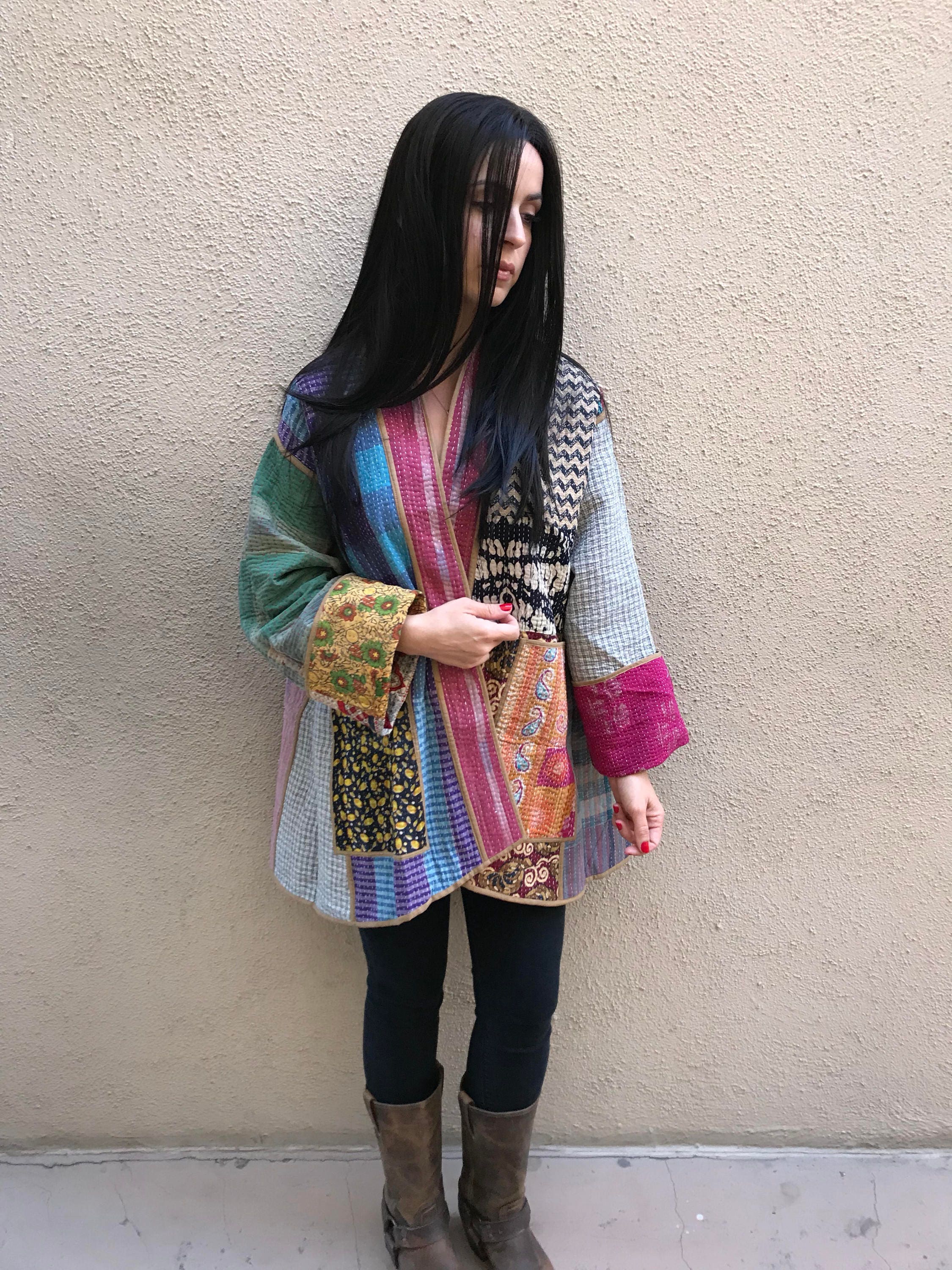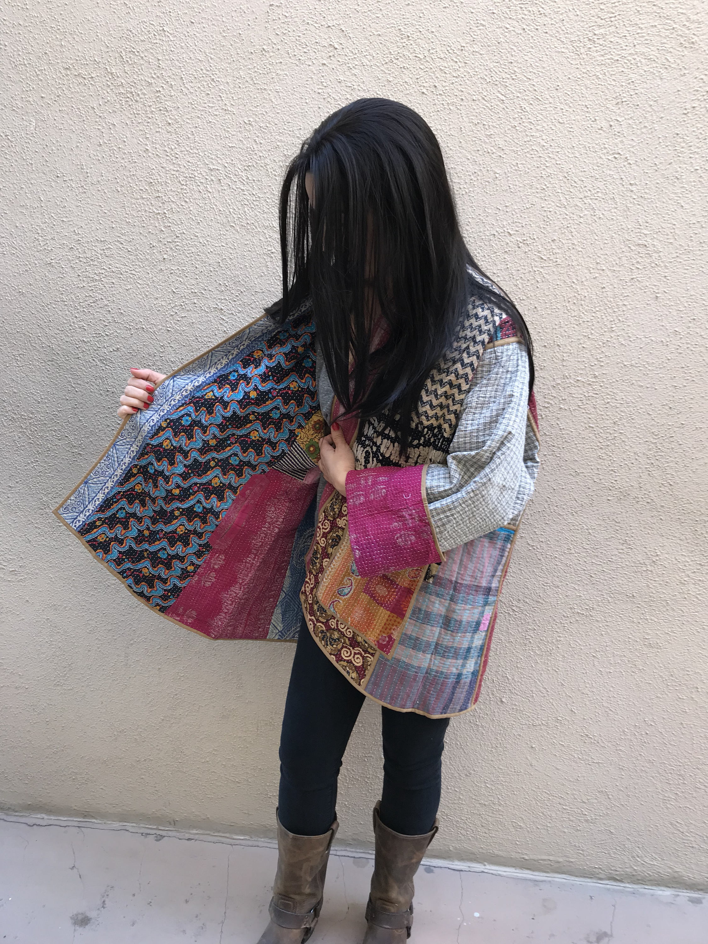 These kantha jackets are made from old vintage kantha quilts. “Kantha” refers to the tiny hand stitch that village women use to sew different pieces of fabric together into the patchwork that becomes the quilt. The quilts are often repaired and patched again by hand. This is part of the charm and unique quality of the quilts. Everything has been upcycled and repurposed. These so called “defects” in the quilts are what make them special, as it gives the garment made from them a feeling of having passed through many loving hands. Hands that repaired instead of discarding. Hands that recycled and repurposed previously discarded used fabrics.