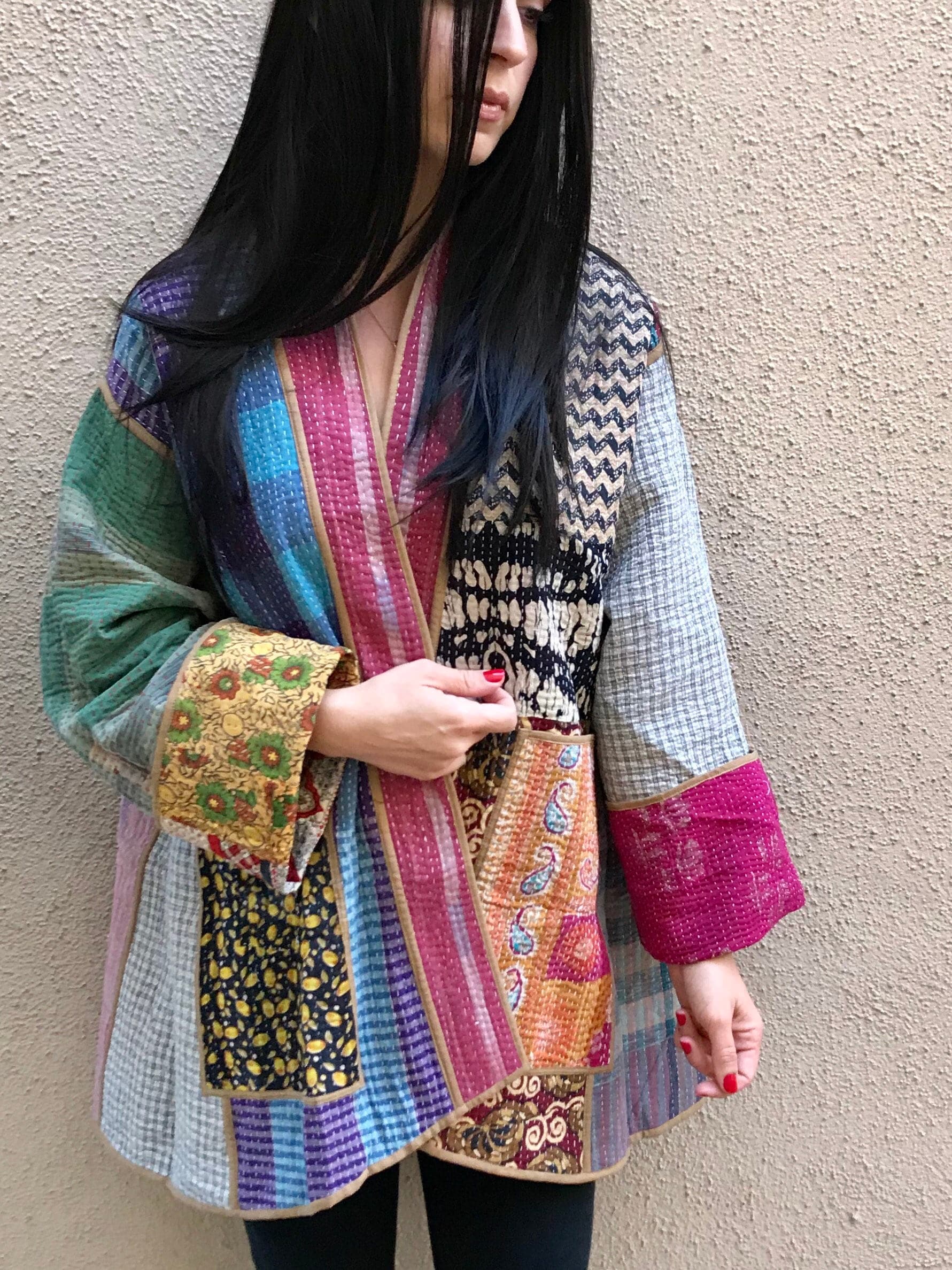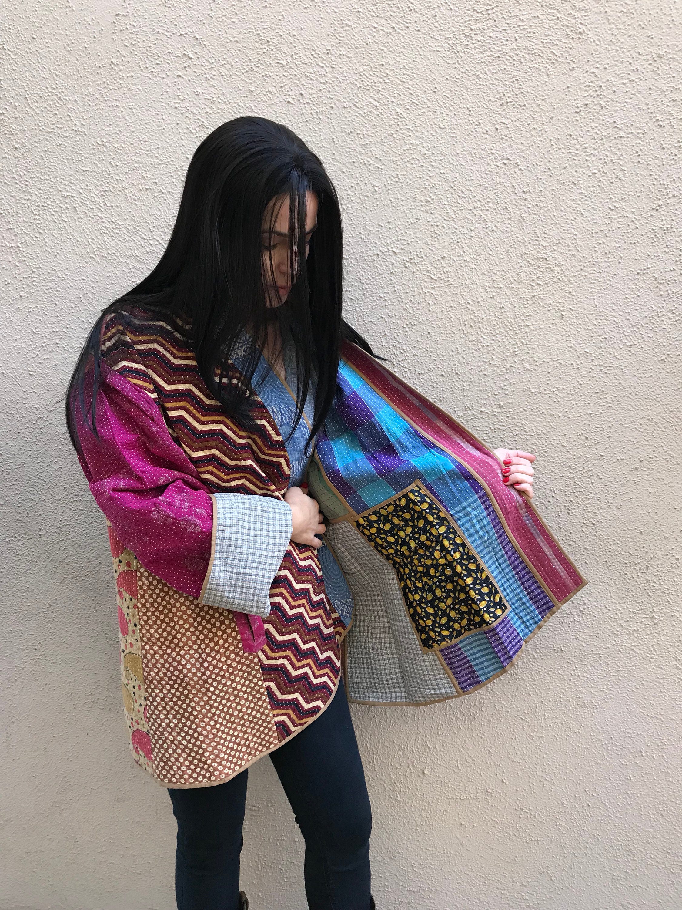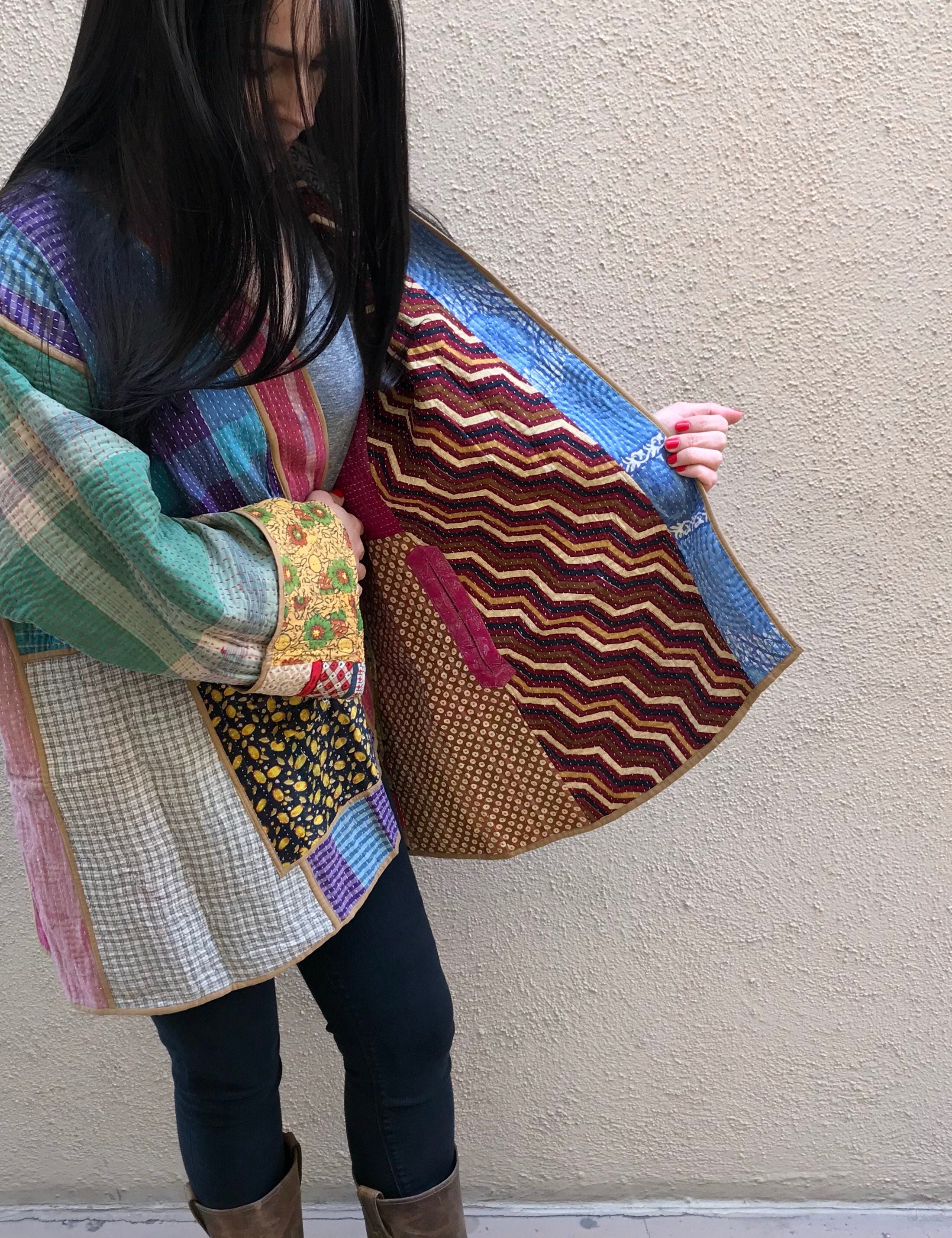 One of a kind reversible cotton Gudri kantha jacket made from vintage cotton quilts.